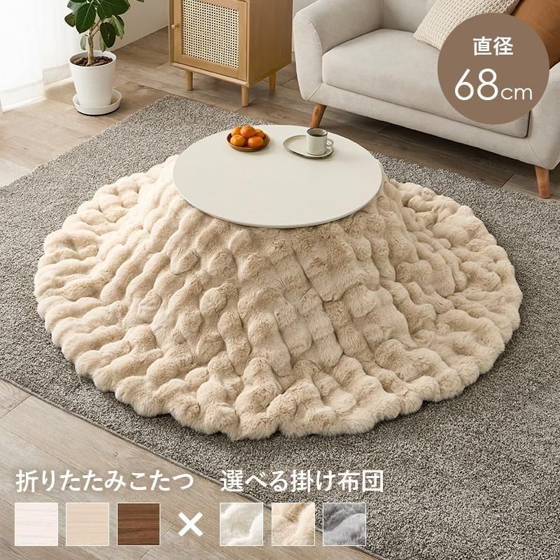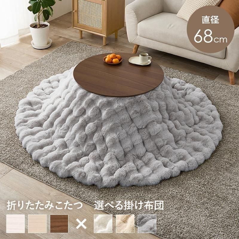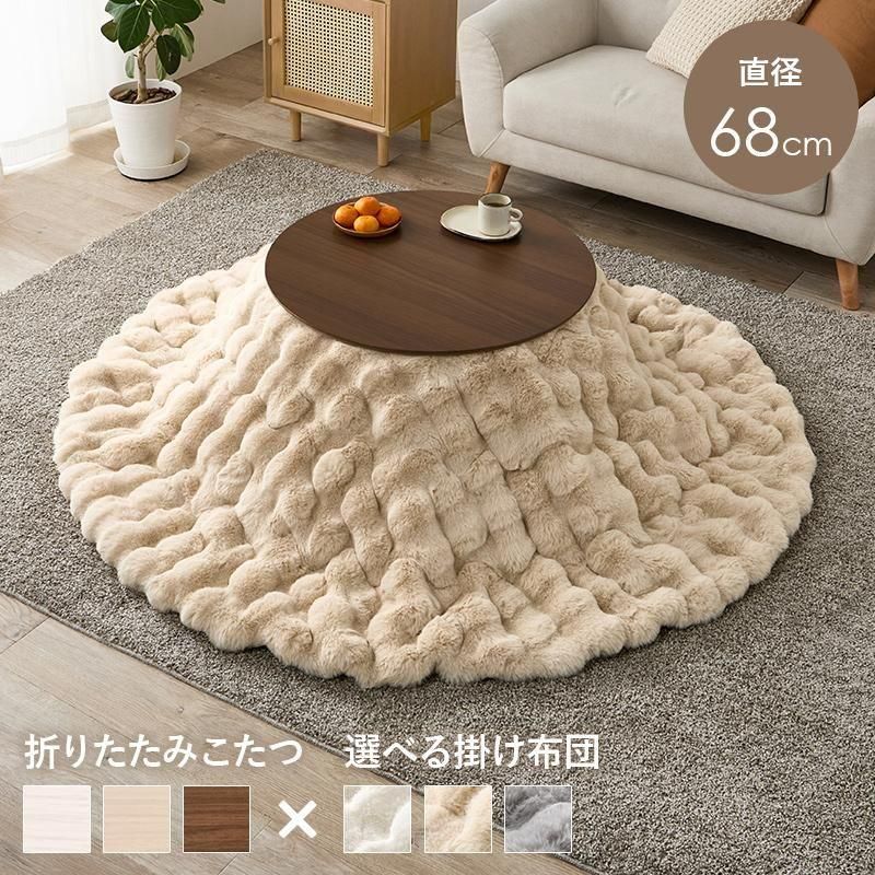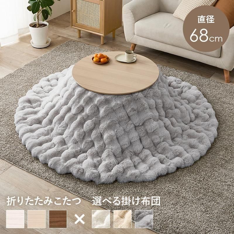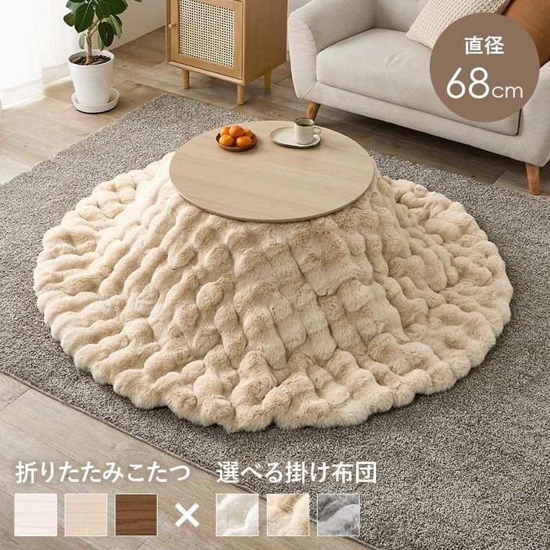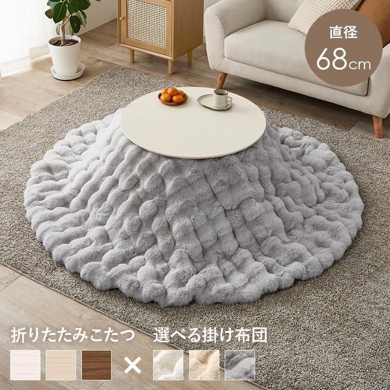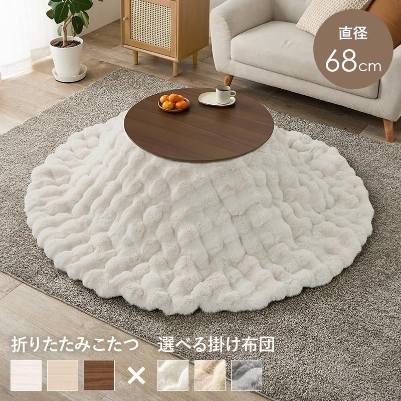 まるくてかわいいフォルムが特徴の丸型こたつ。コンパクトに収納できる折れ脚タイプ。ラビットファーのような、ふわもこの掛け布団セット