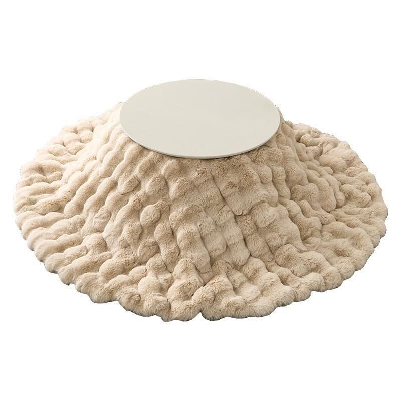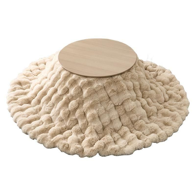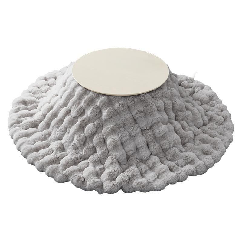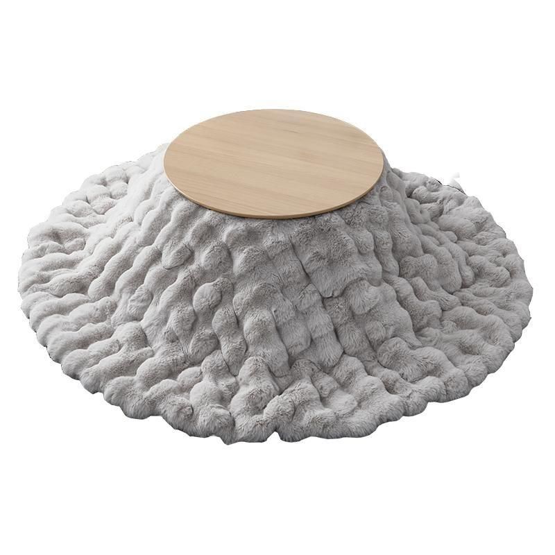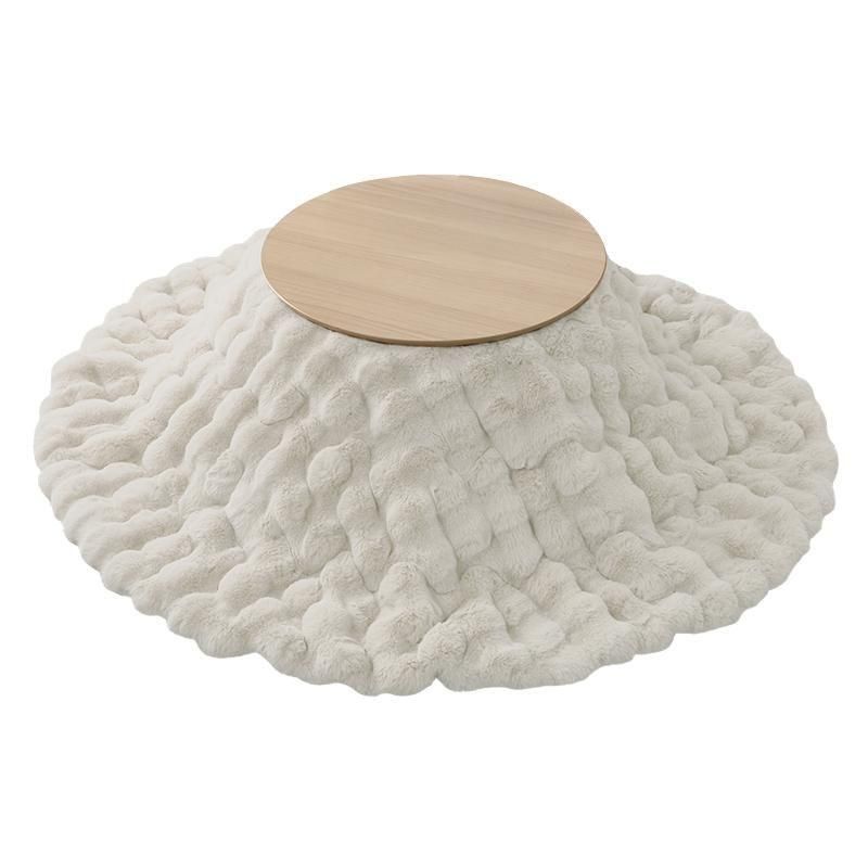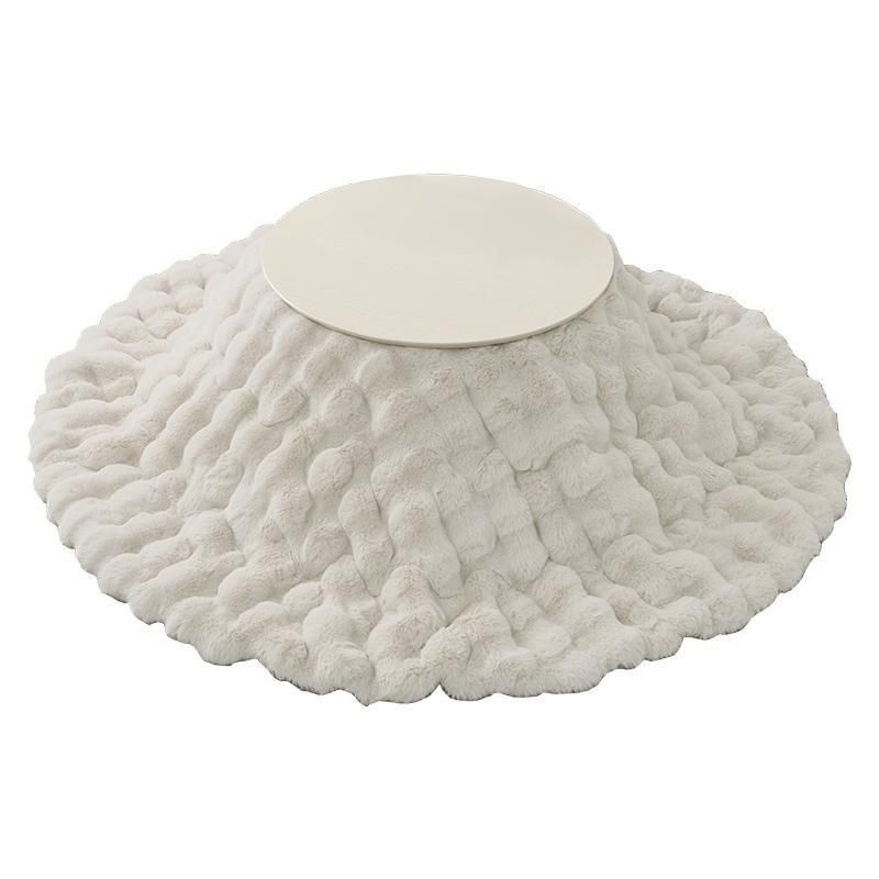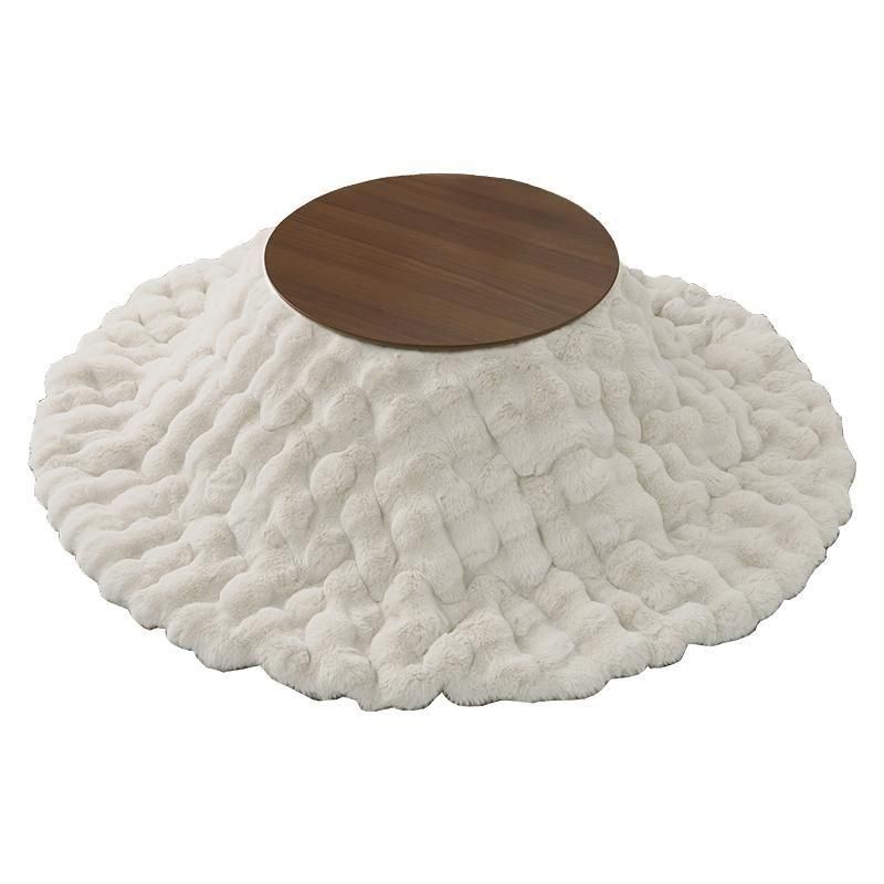 まるくてかわいいフォルムが特徴の丸型こたつ。コンパクトに収納できる折れ脚タイプ。ラビットファーのような、ふわもこの掛け布団セット