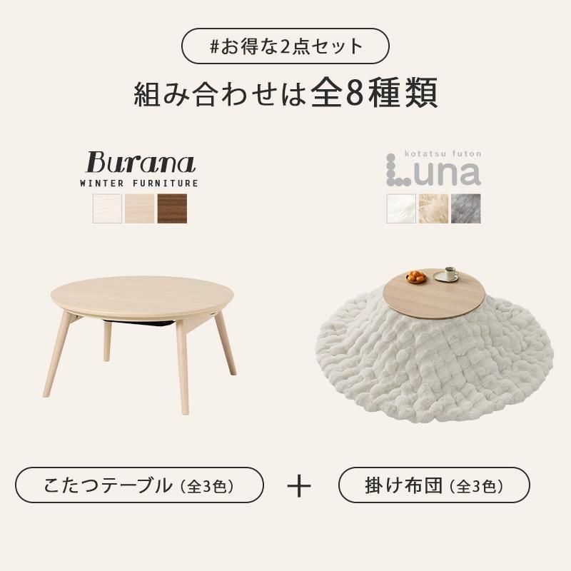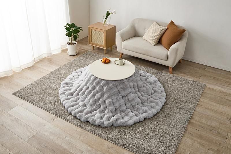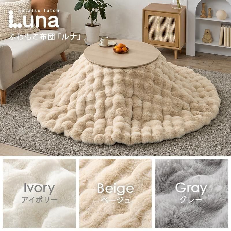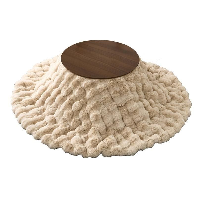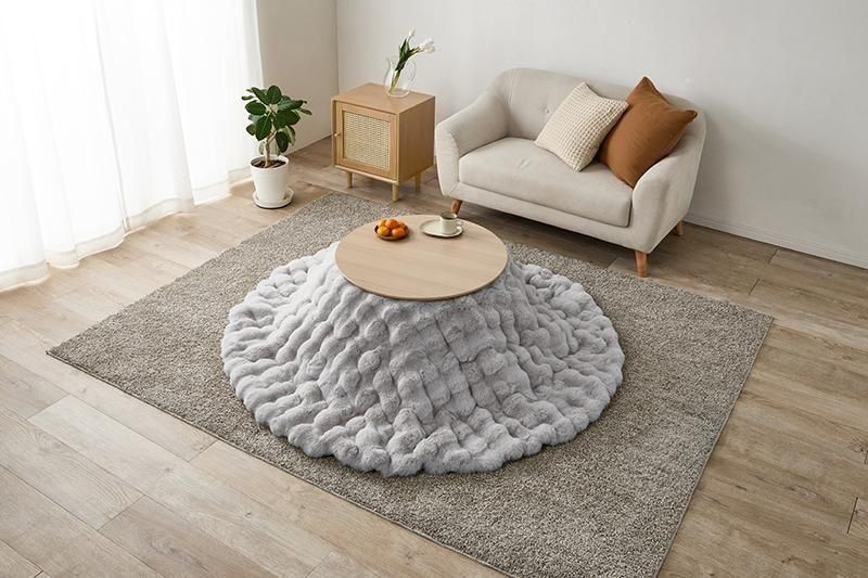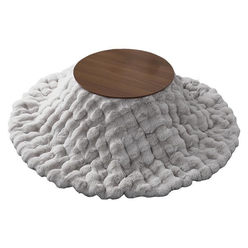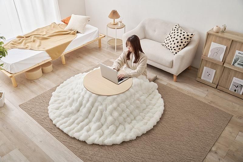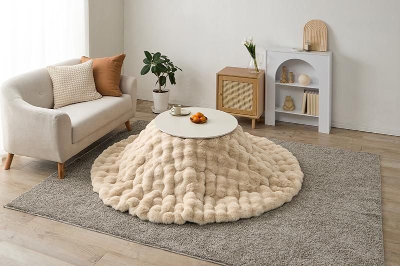 まるくてかわいいフォルムが特徴の丸型こたつ。コンパクトに収納できる折れ脚タイプ。ラビットファーのような、ふわもこの掛け布団セット