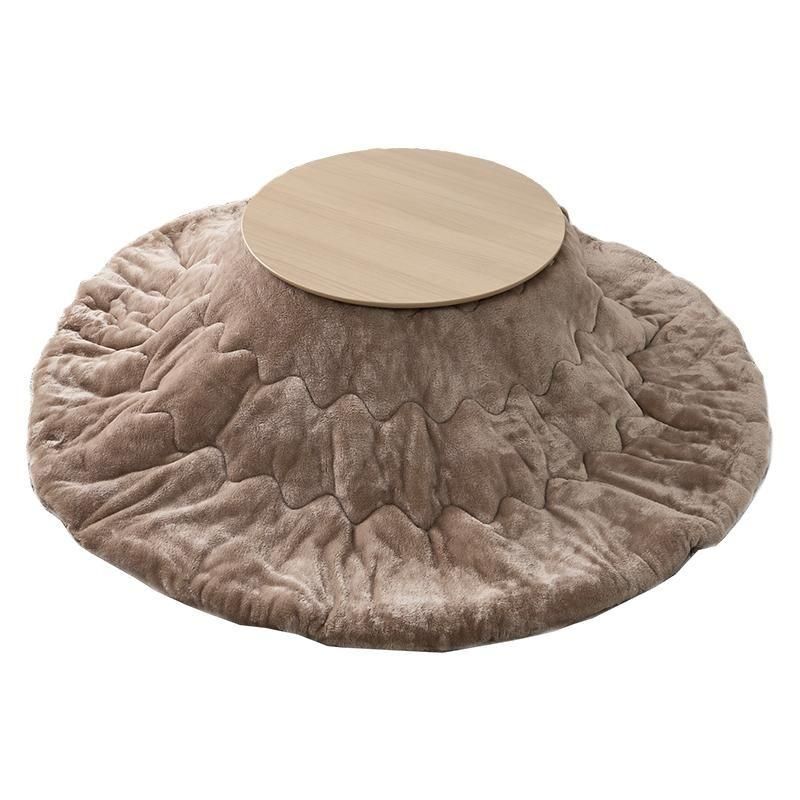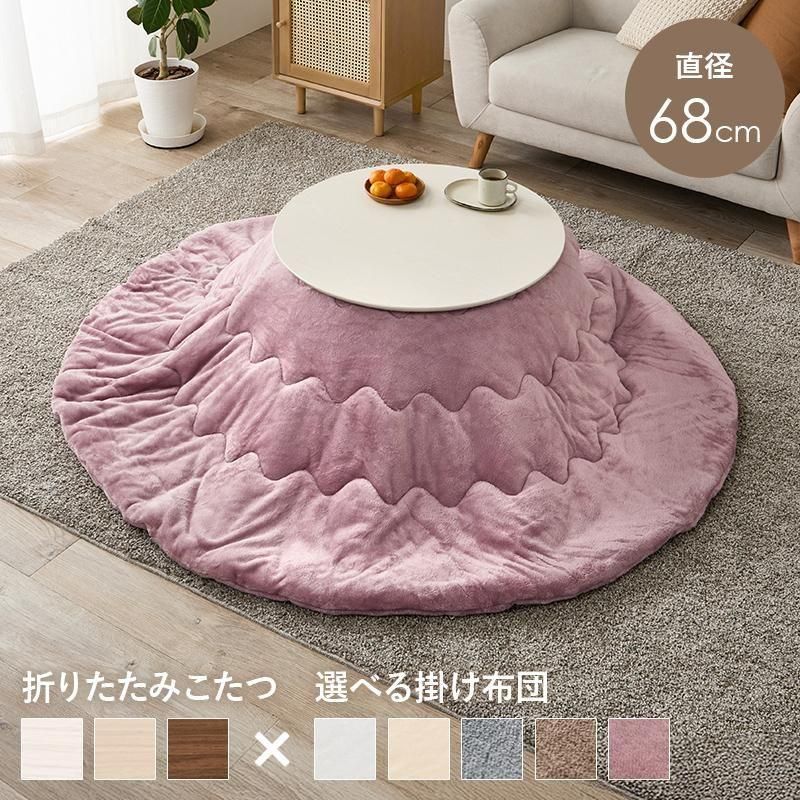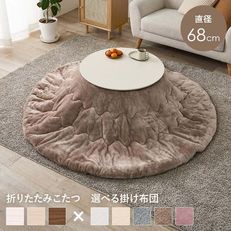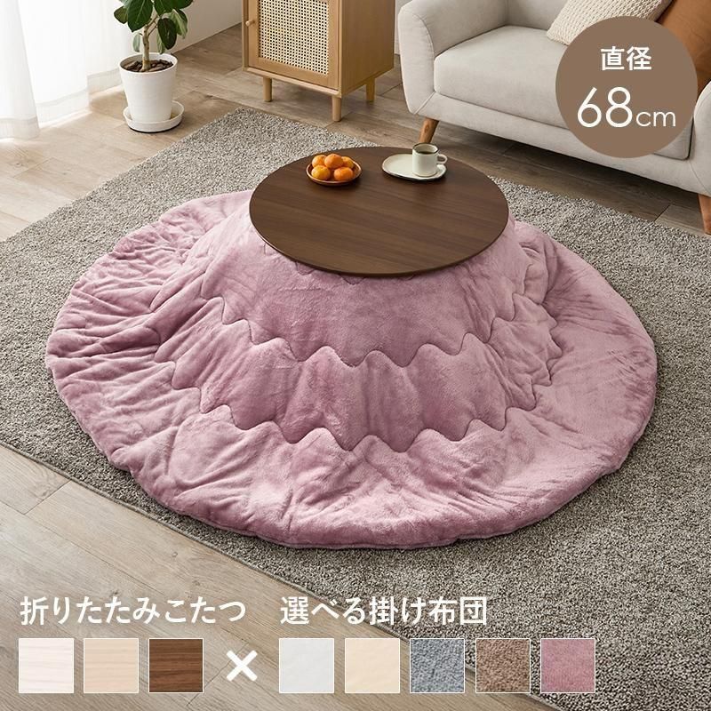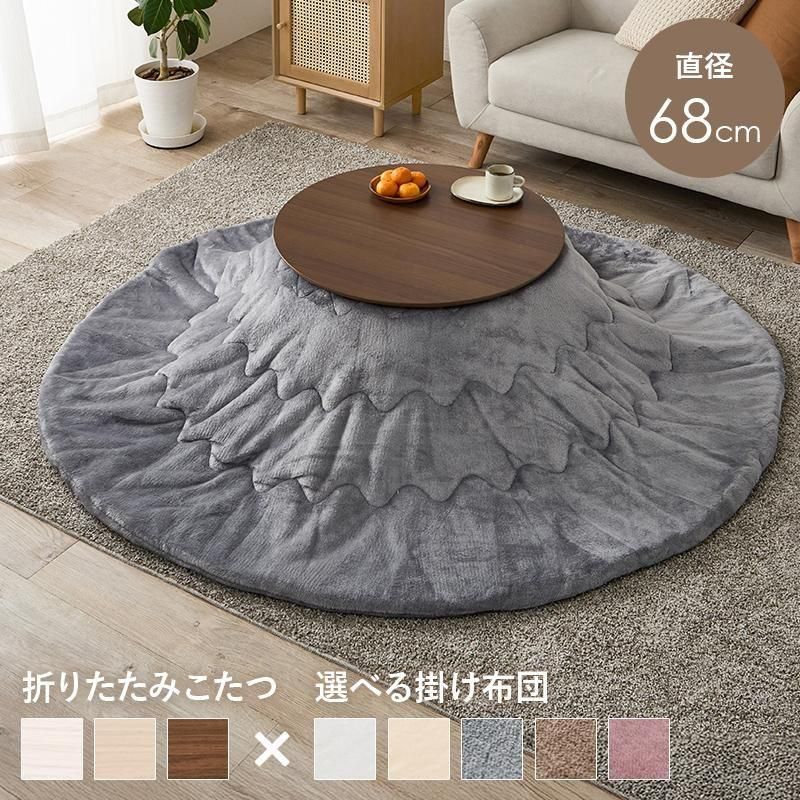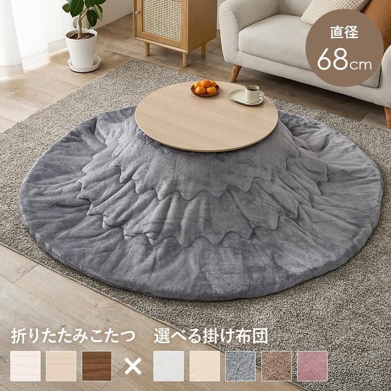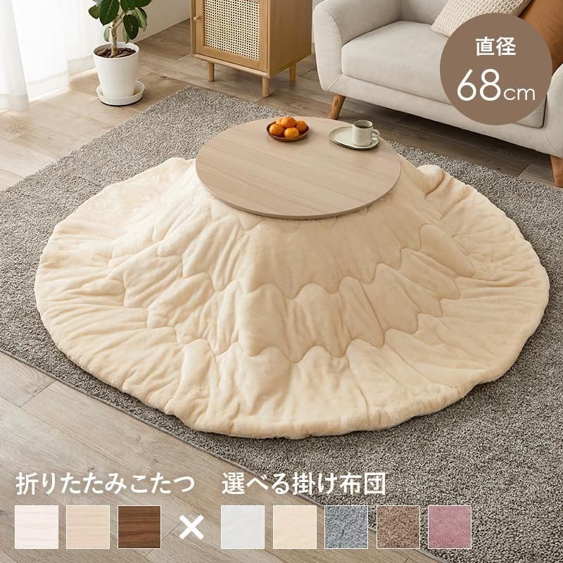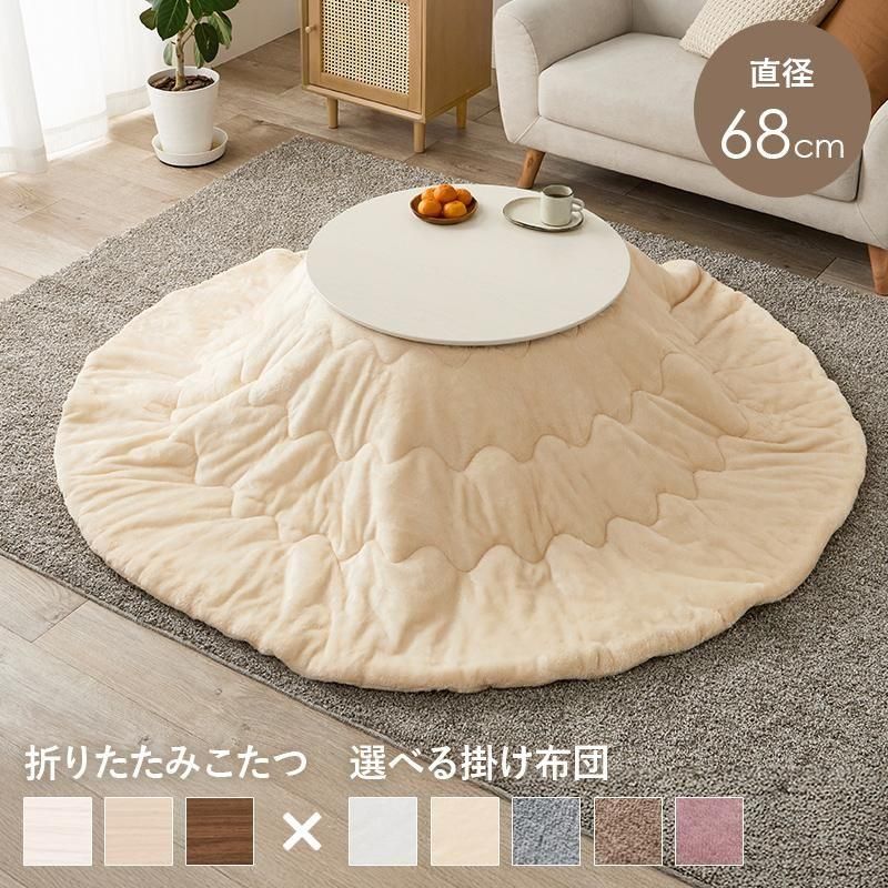 まるくてかわいいフォルムが特徴の丸型こたつ。コンパクトに収納できる折れ脚タイプ。とろけるような肌触りのシンプルな掛け布団セット