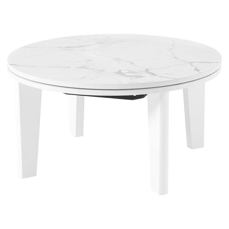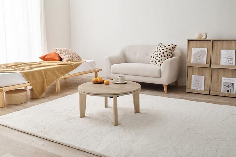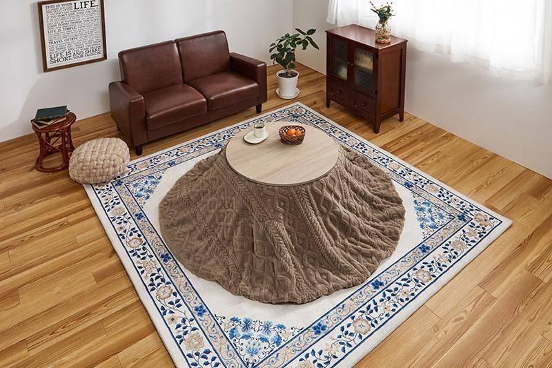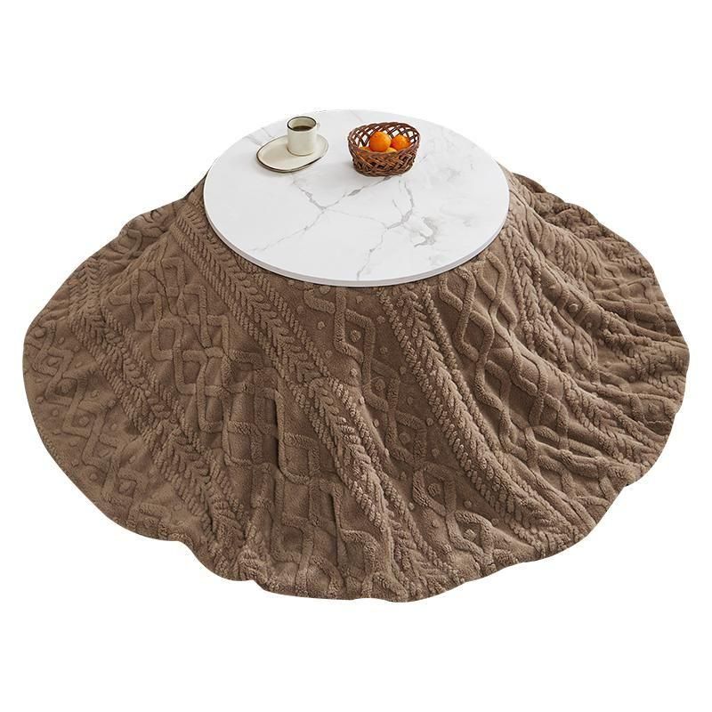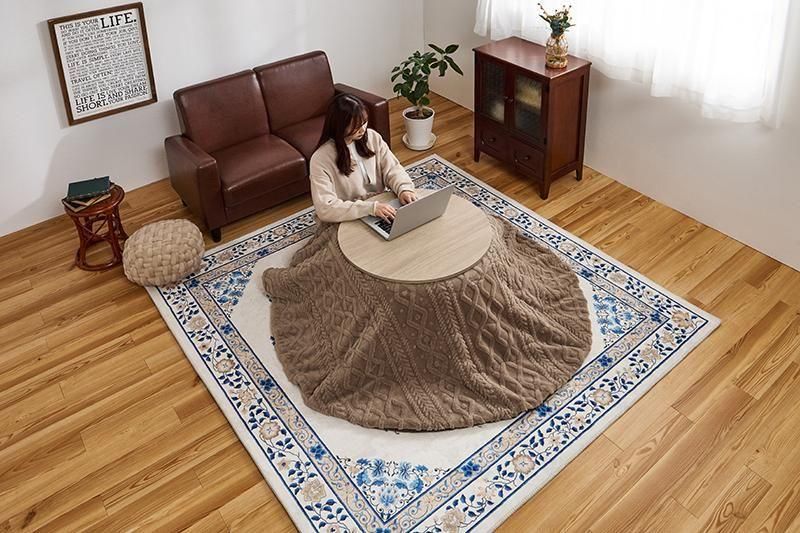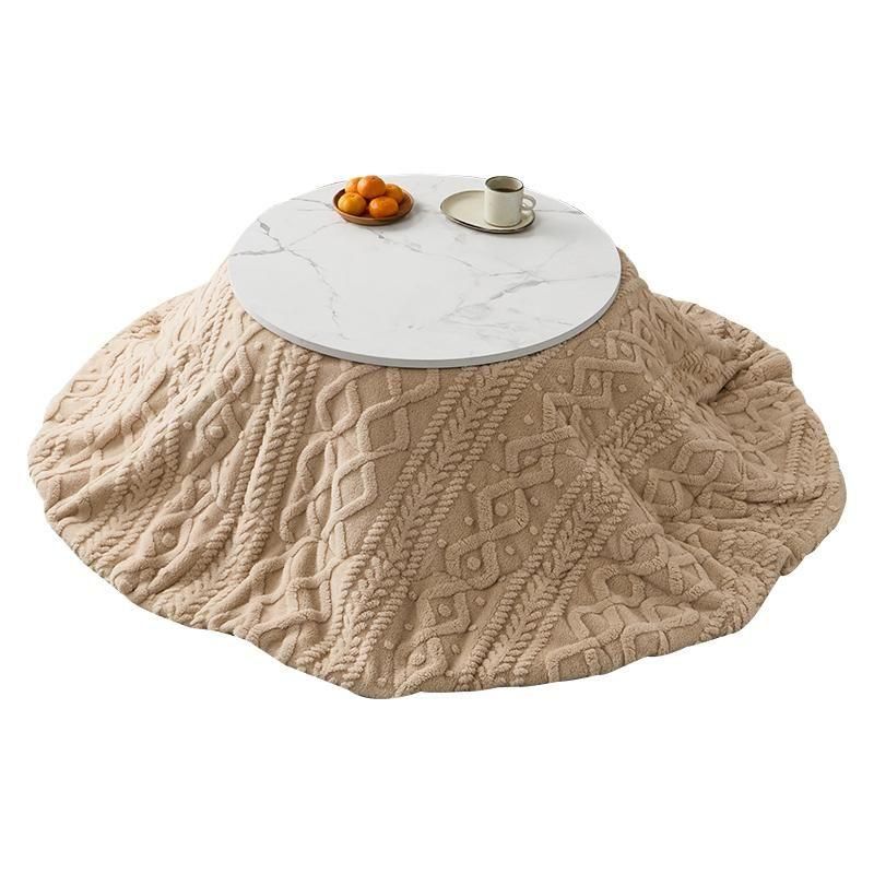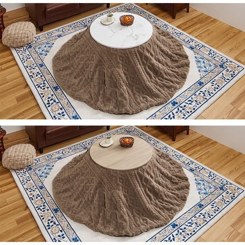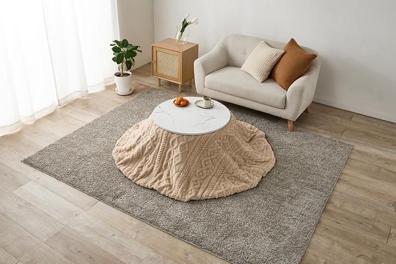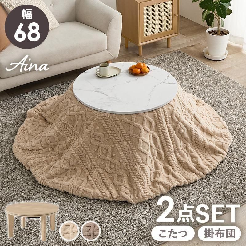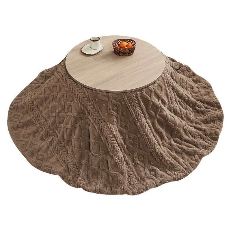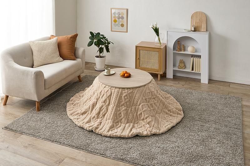 柔らかい印象を与える丸形天板のおしゃれなコンパクトこたつ。セーターのような立体的なデザインがおしゃれな掛け布団セット