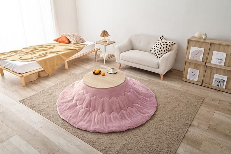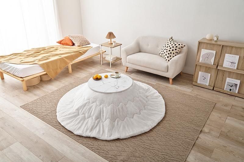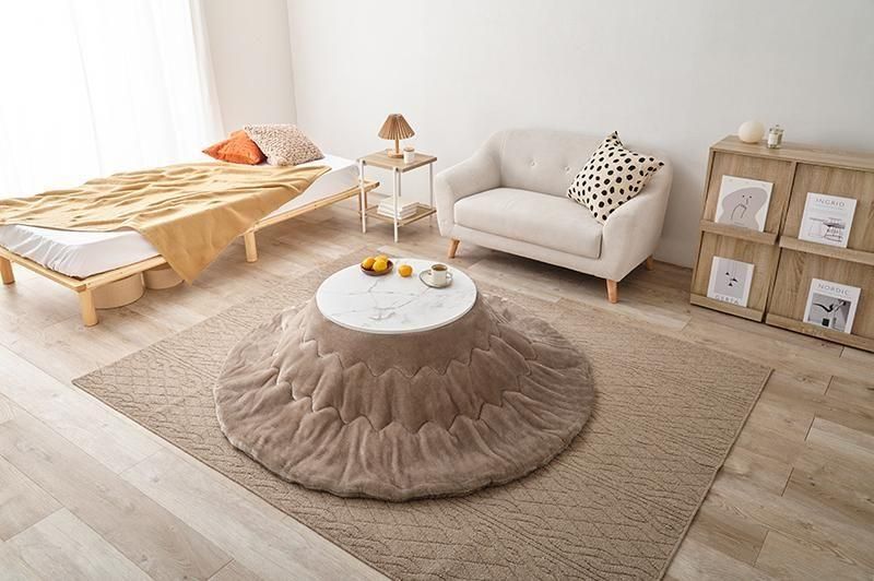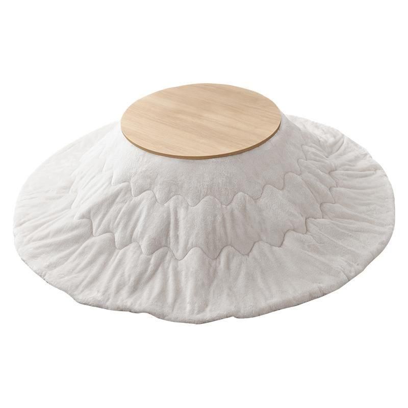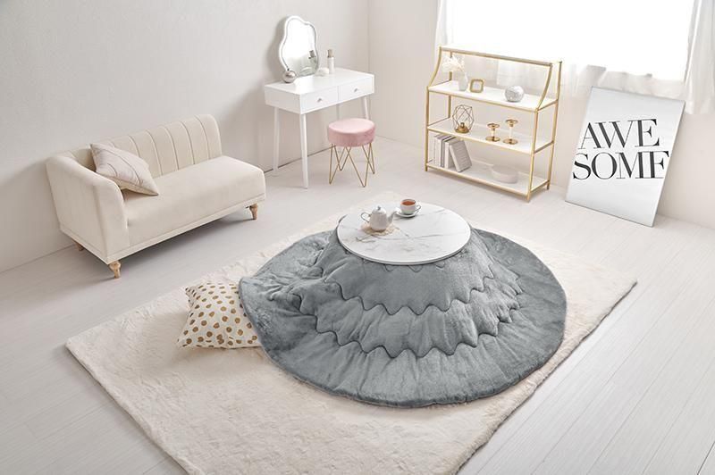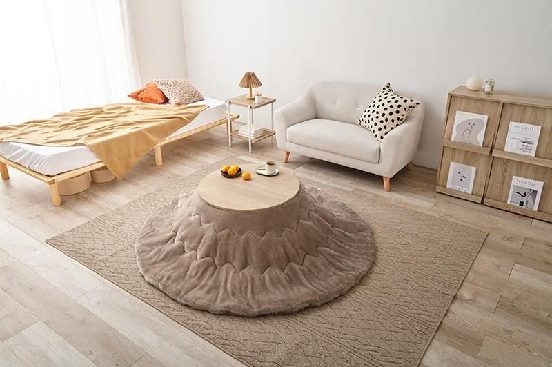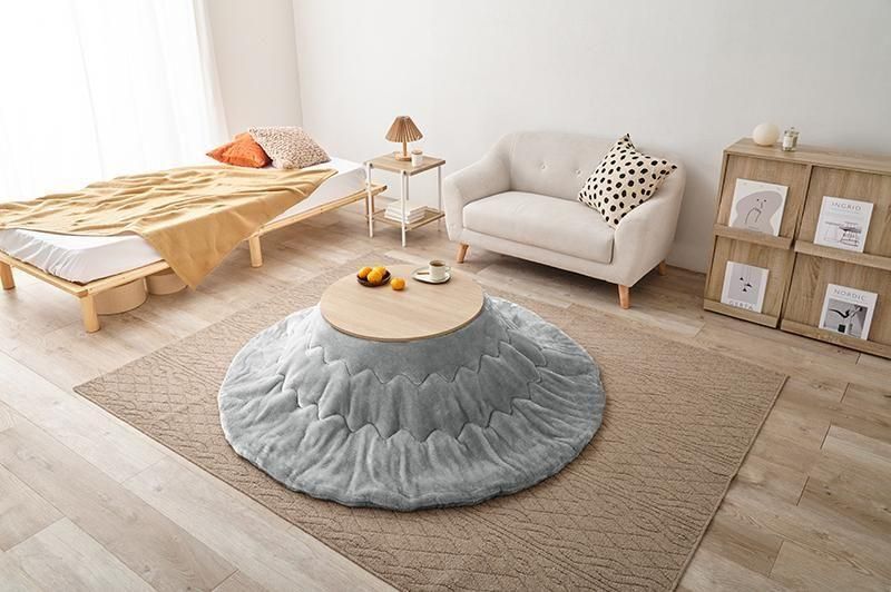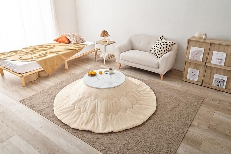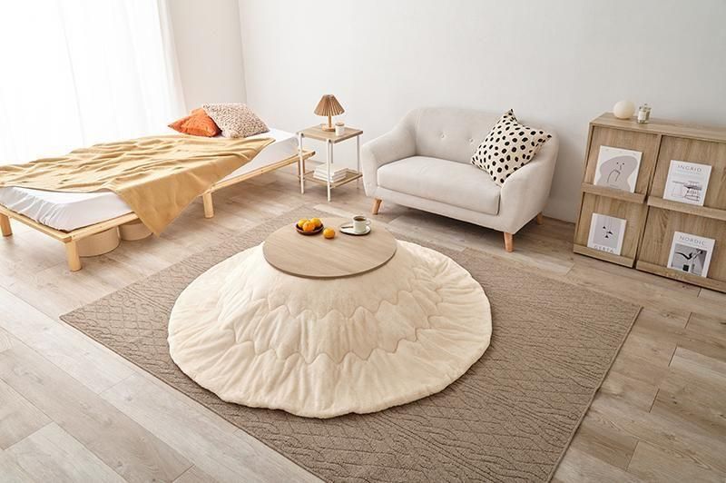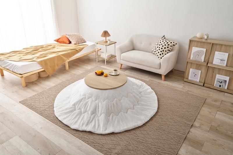 柔らかい印象を与える丸形天板のおしゃれなコンパクトこたつ。とろけるような肌触りのシンプルな掛け布団セット