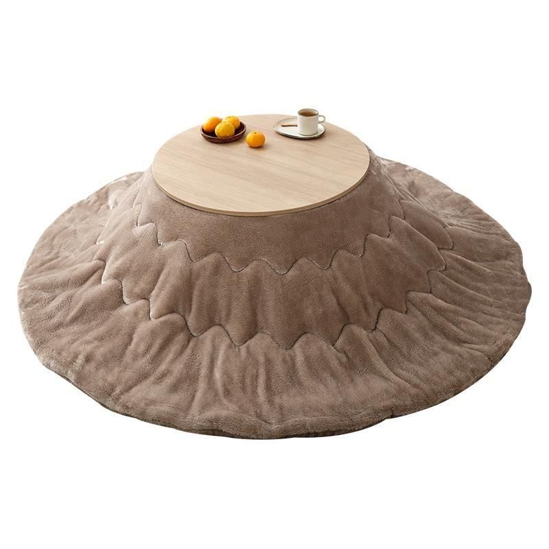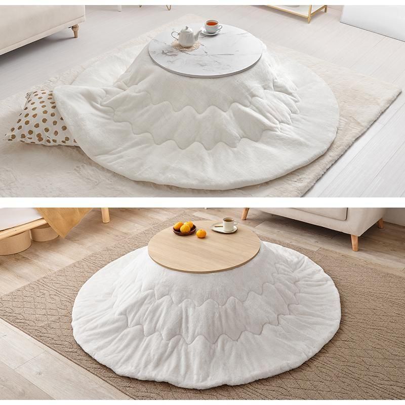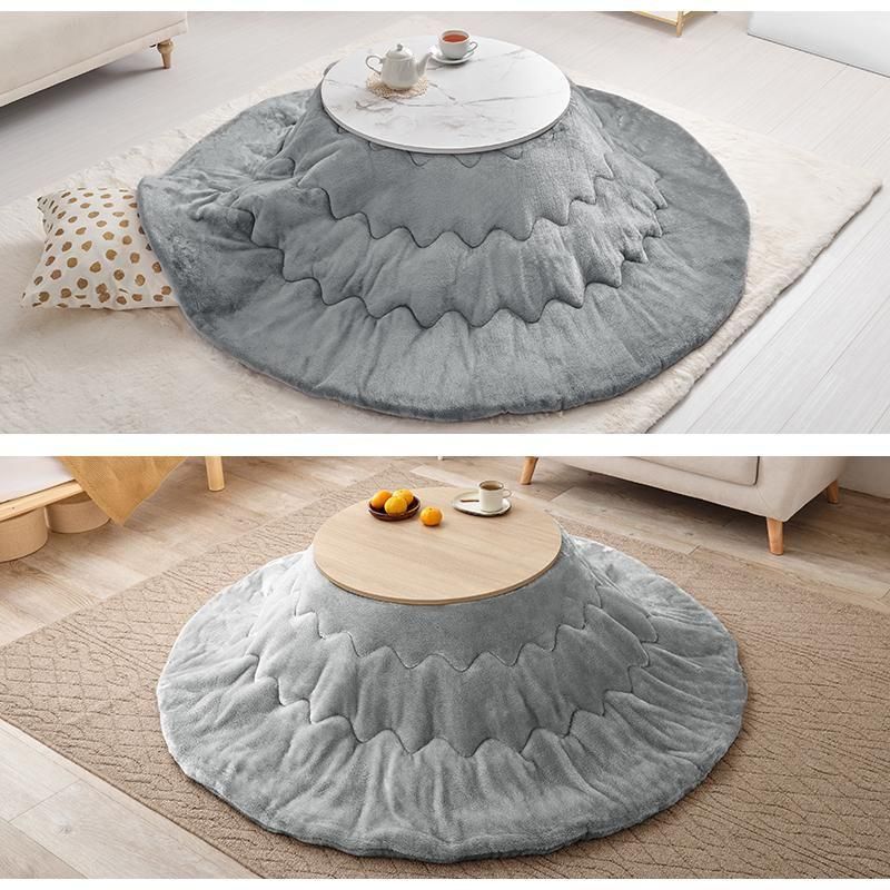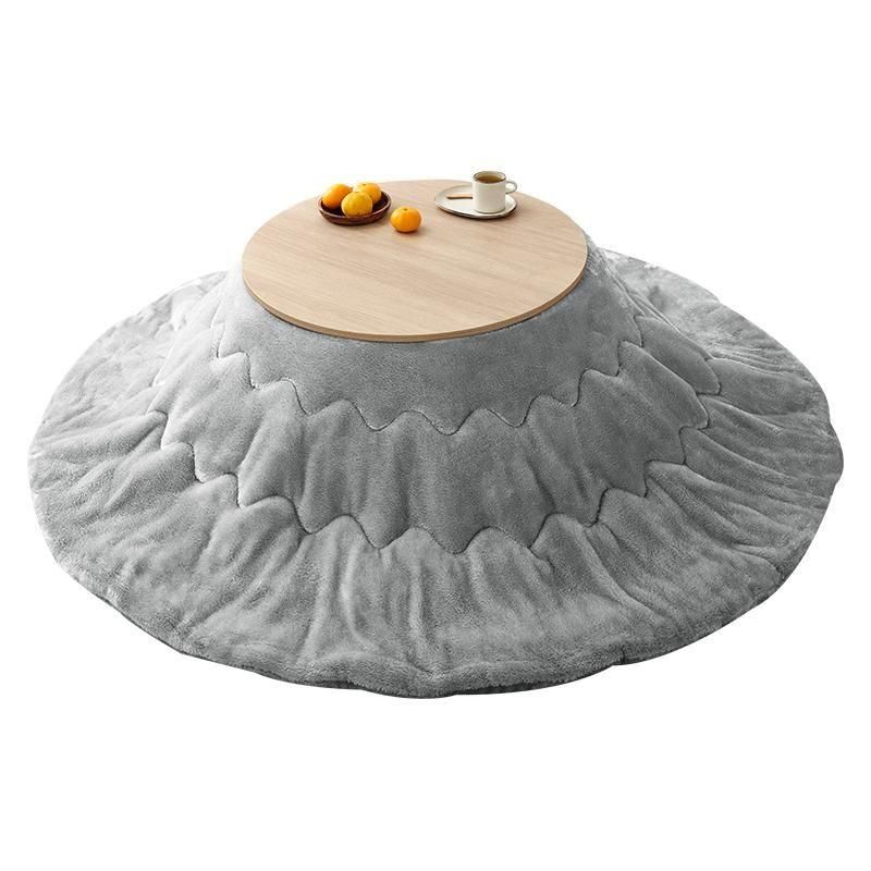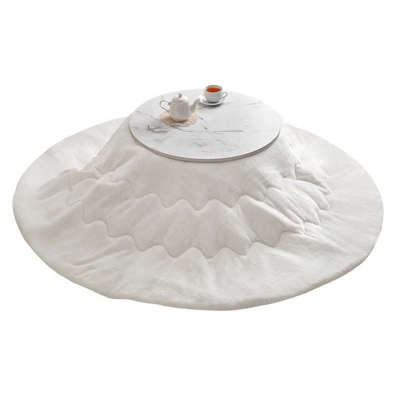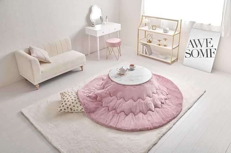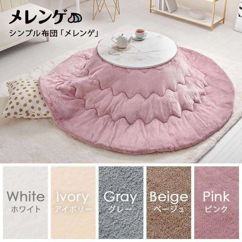柔らかい印象を与える丸形天板のおしゃれなコンパクトこたつ。とろけるような肌触りのシンプルな掛け布団セット