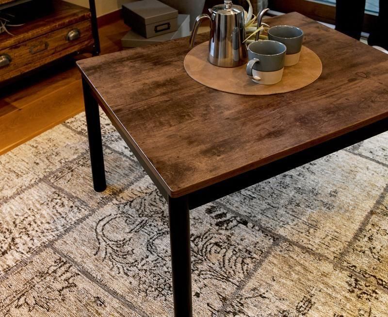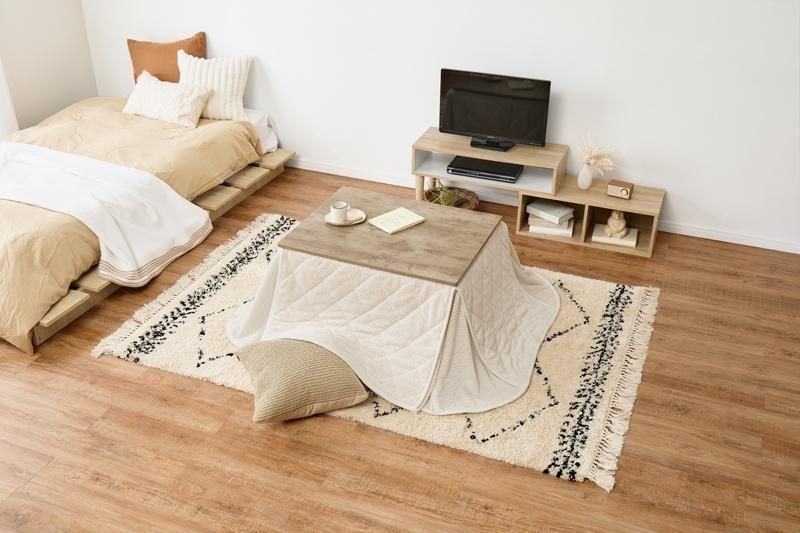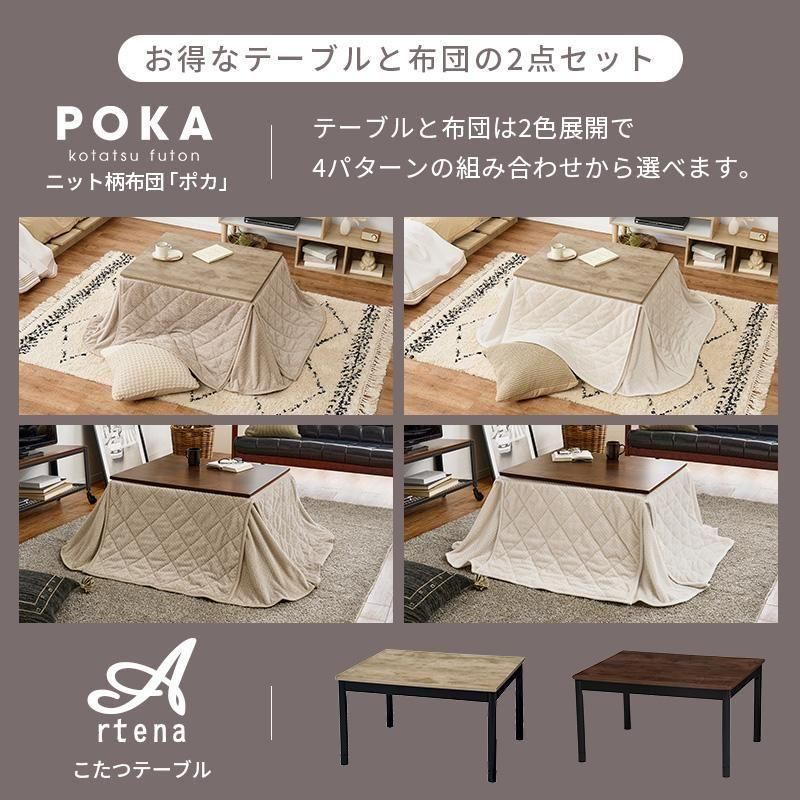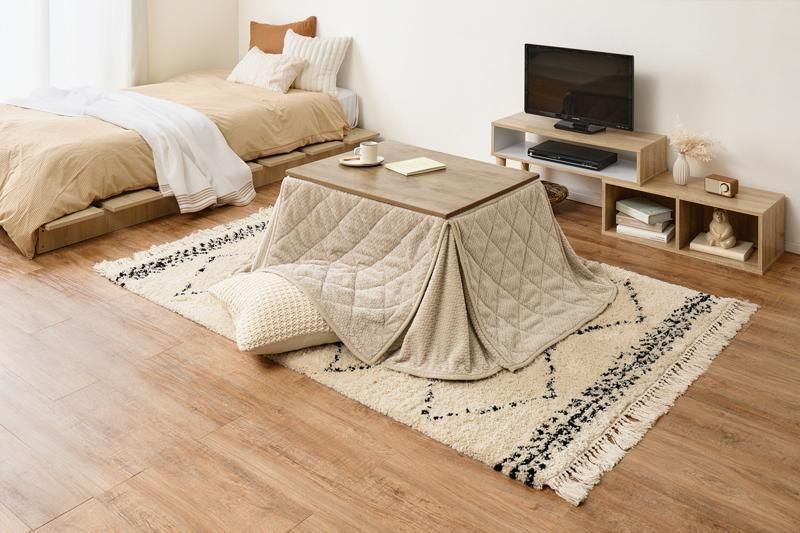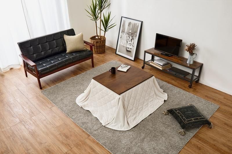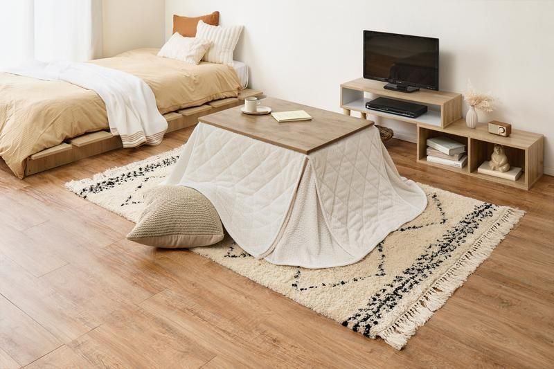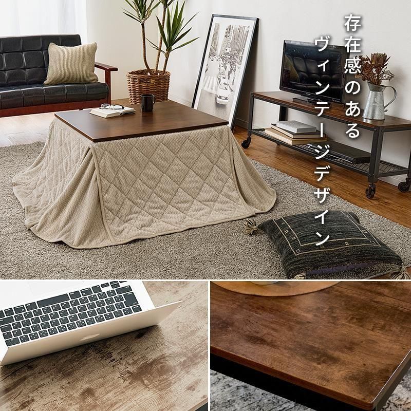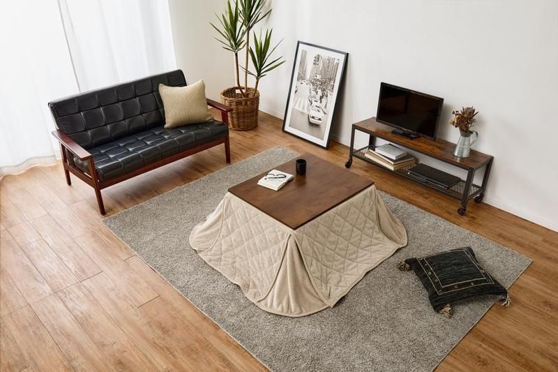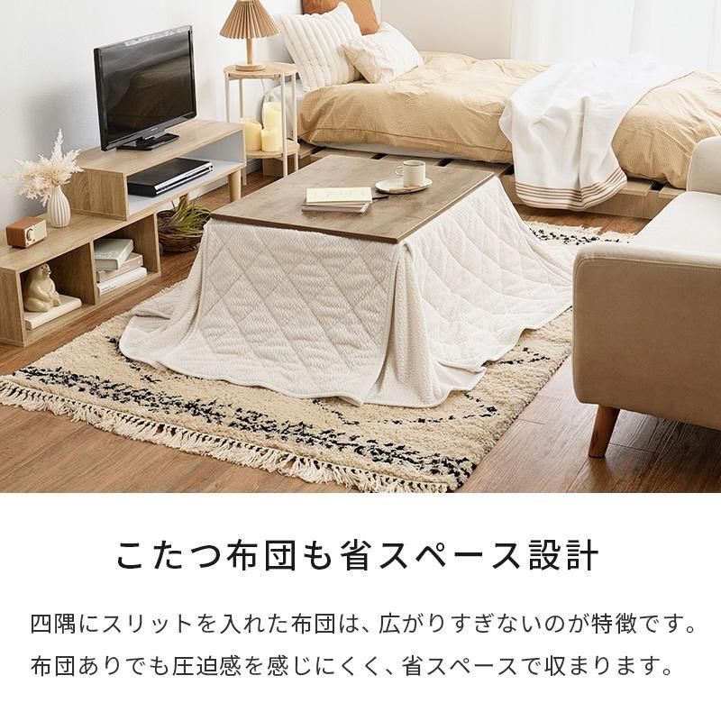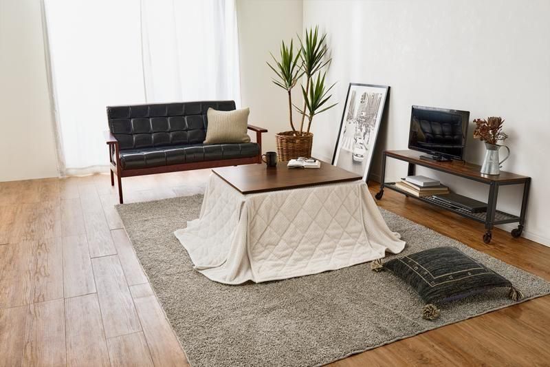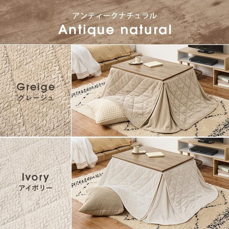 古木調の天板にスマートな脚、ビンテージデザインのコンパクトこたつ。立体感のあるニット柄の省スペース掛け布団セット