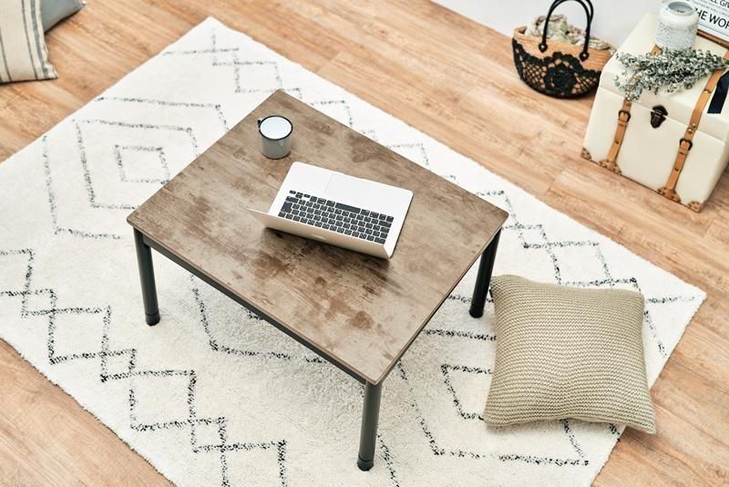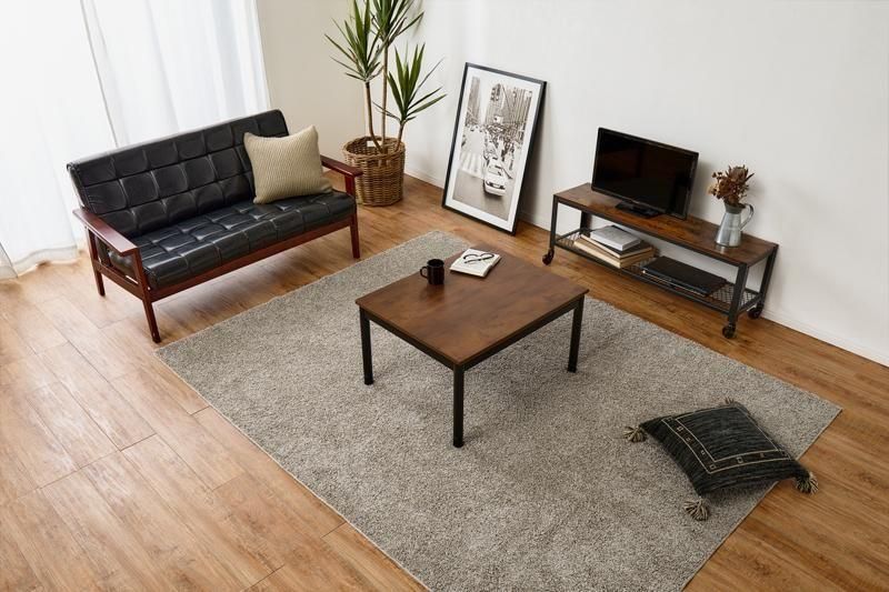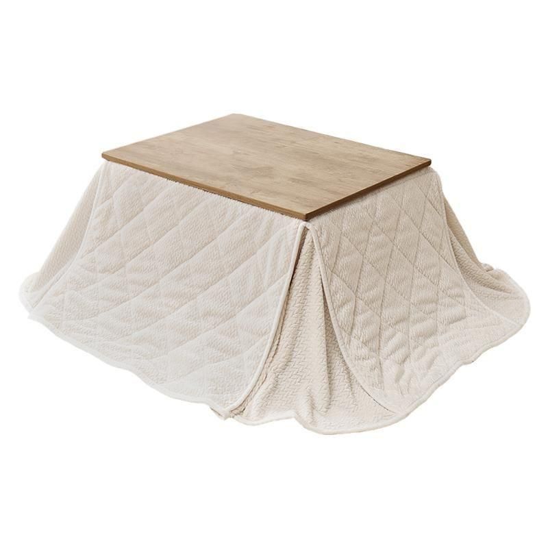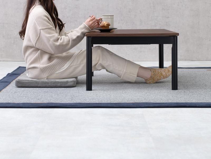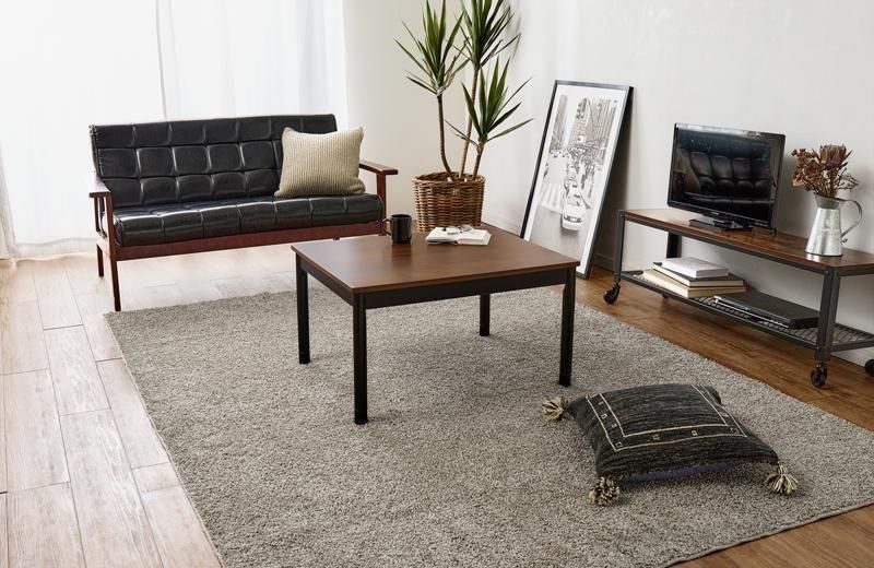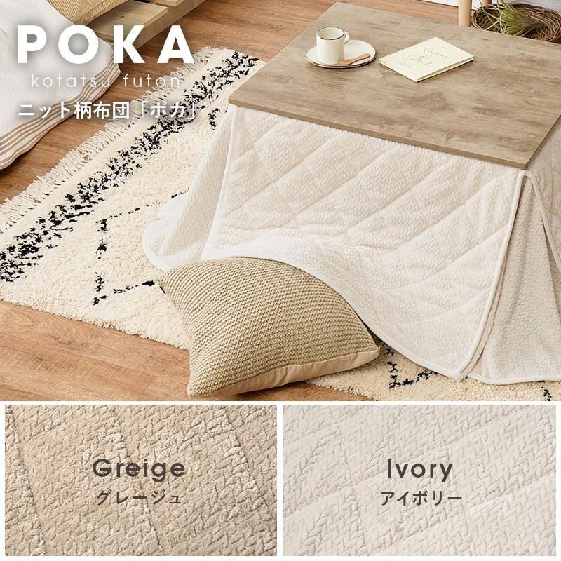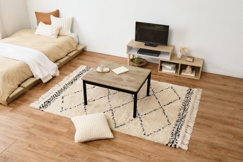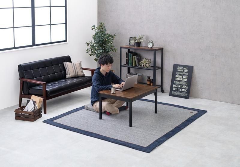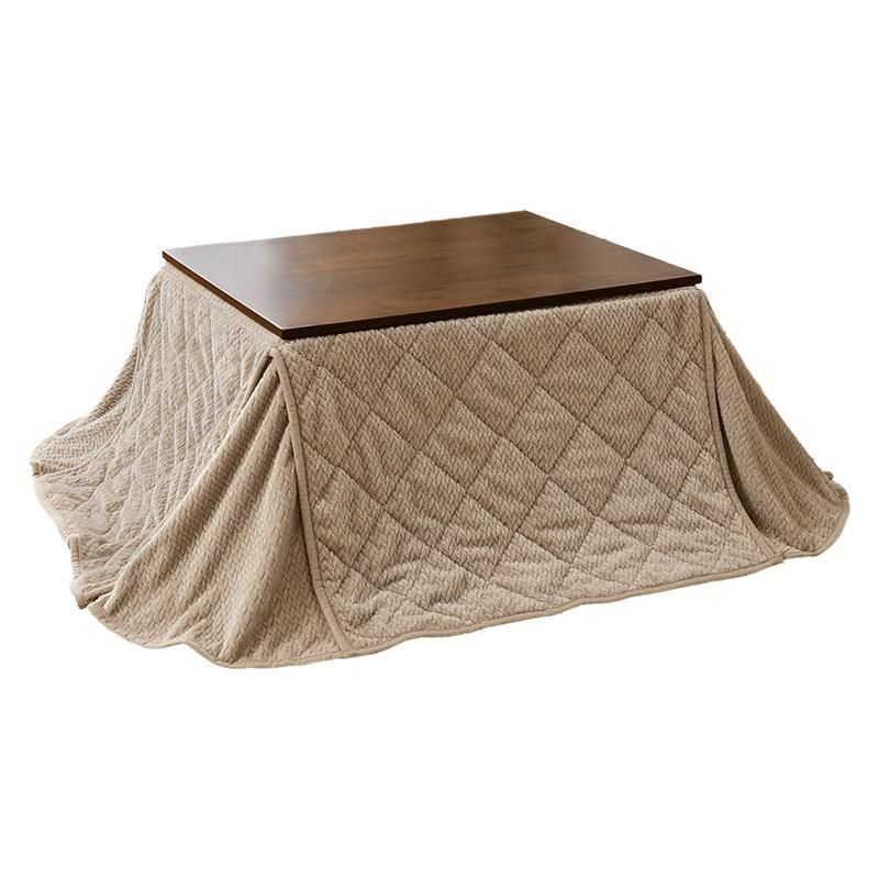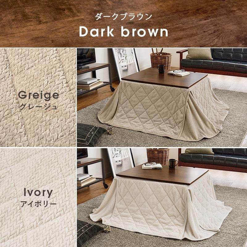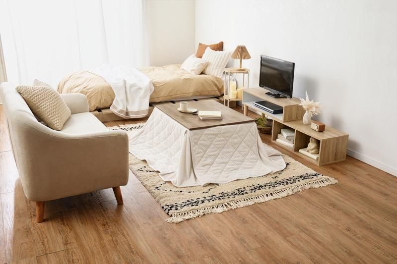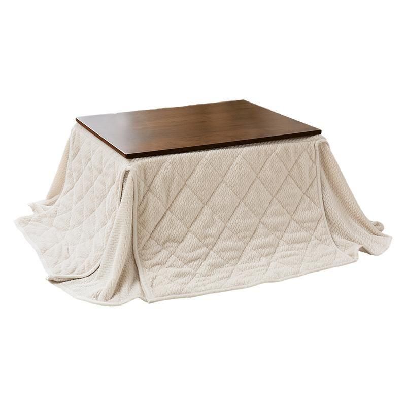 古木調の天板にスマートな脚、ビンテージデザインのコンパクトこたつ。立体感のあるニット柄の省スペース掛け布団セット