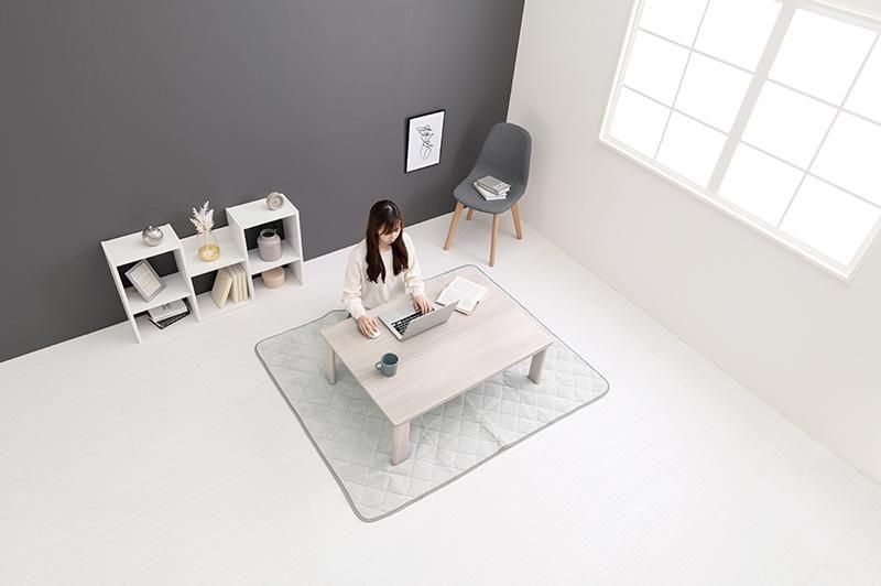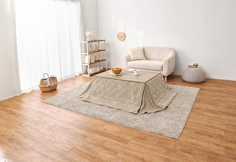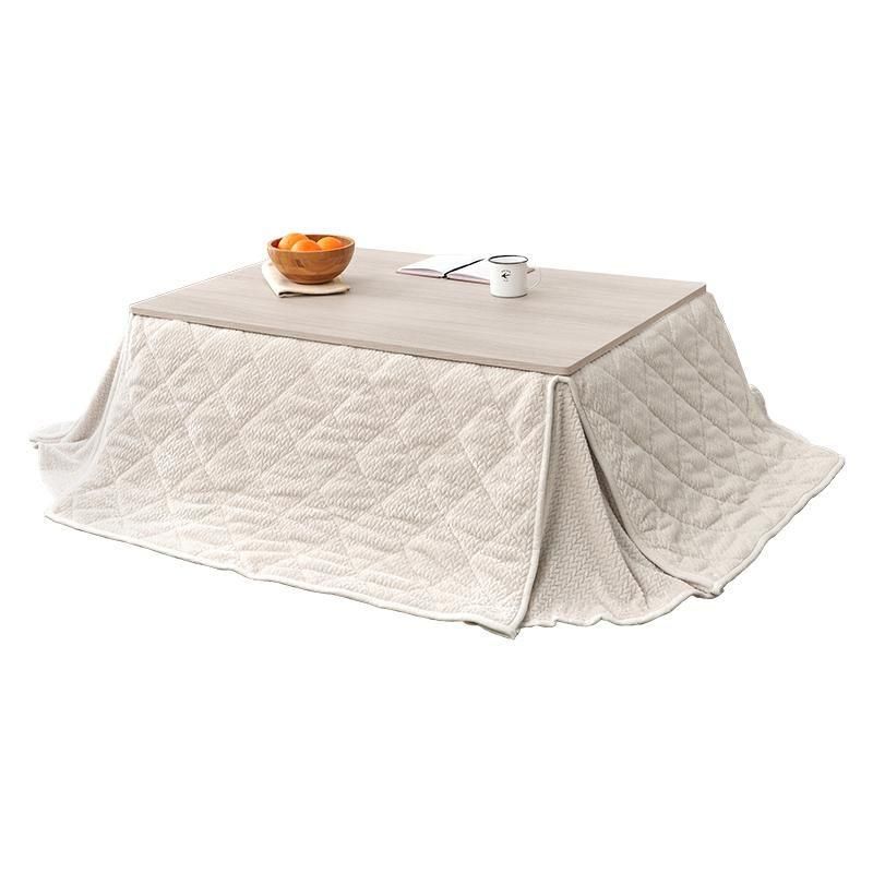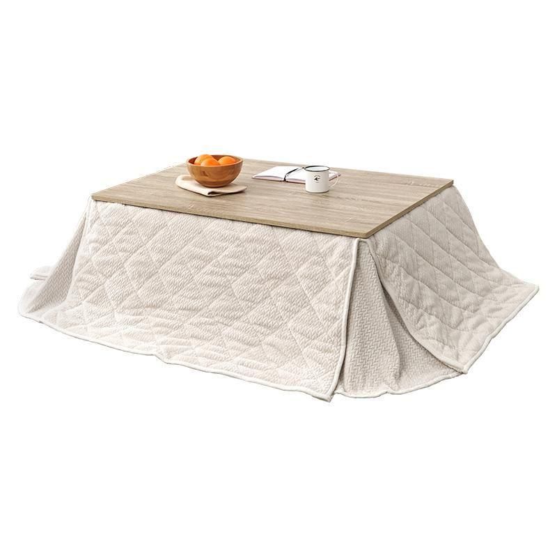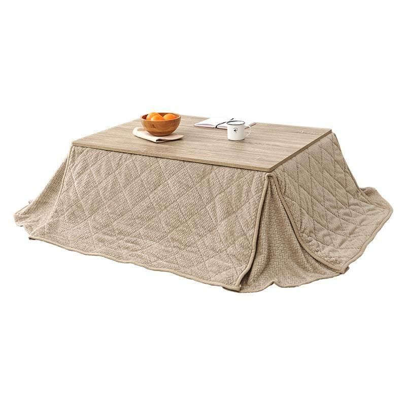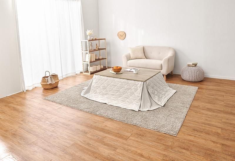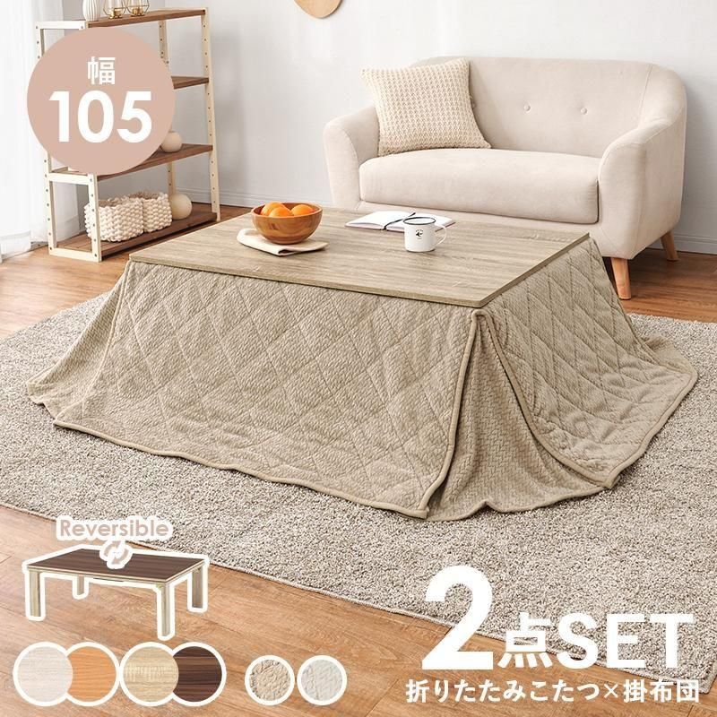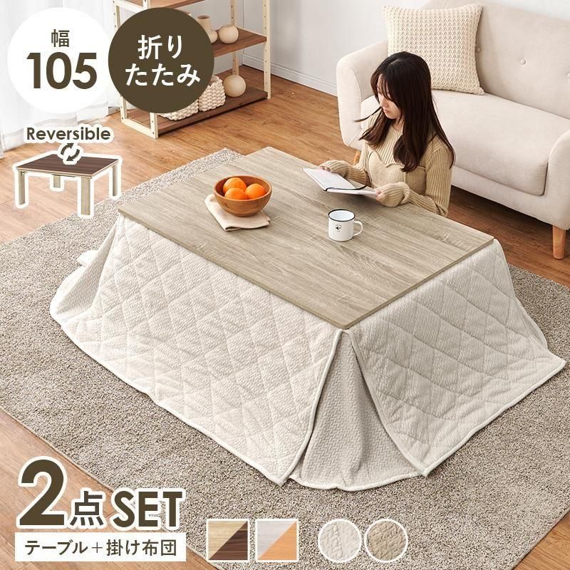 シンプルなデザインで天板リバーシブル、収納に便利な折れ脚コタツ。立体感のあるニット柄の省スペース掛け布団セット