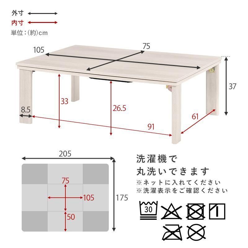 - サイズ : こたつ:(約)幅105×奥行75×高さ37cm、掛ふとん:(約)205×175cm
