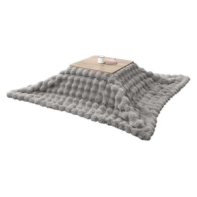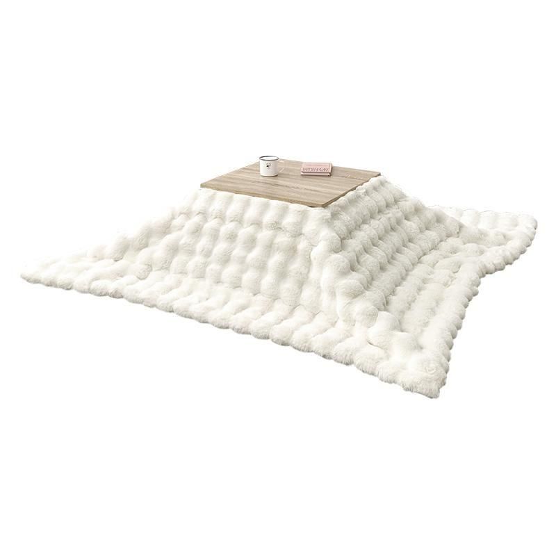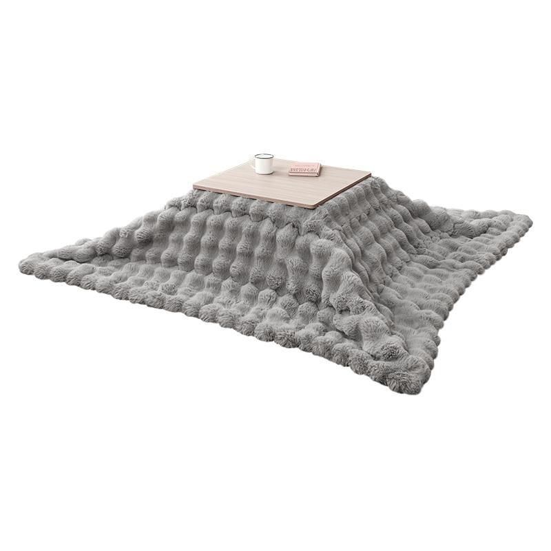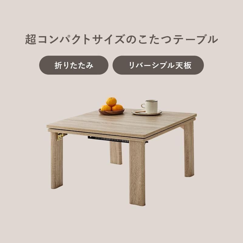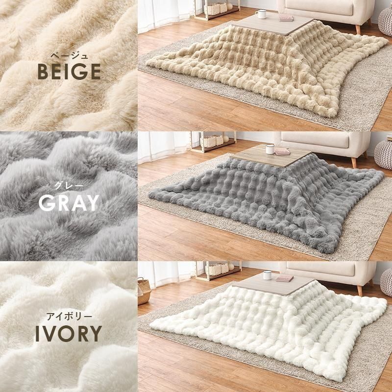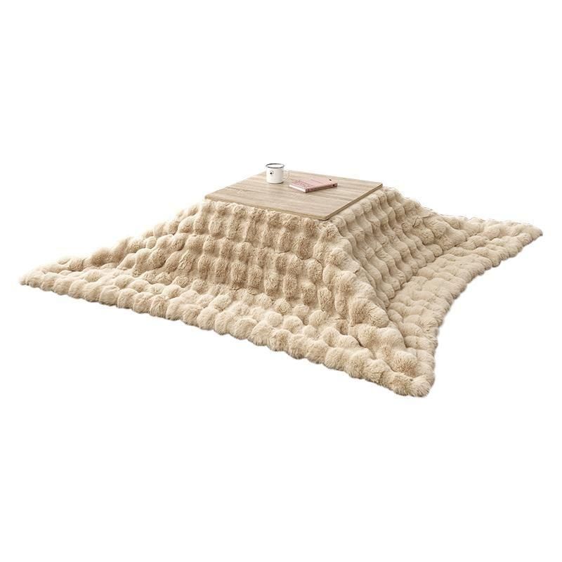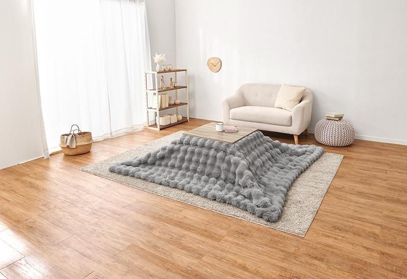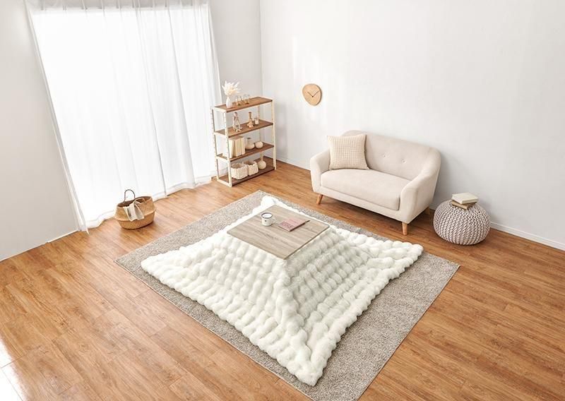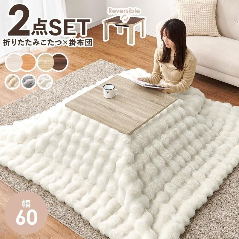シンプルなデザインで天板リバーシブル、収納に便利な折れ脚コタツ。ラビットファーのような、ふわもこの掛け布団セット