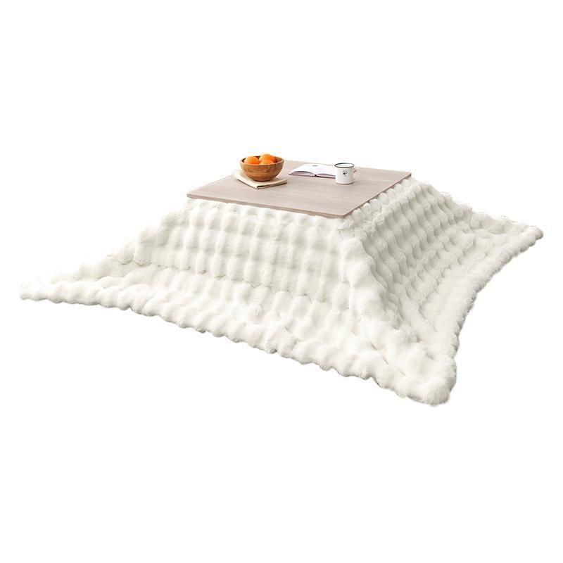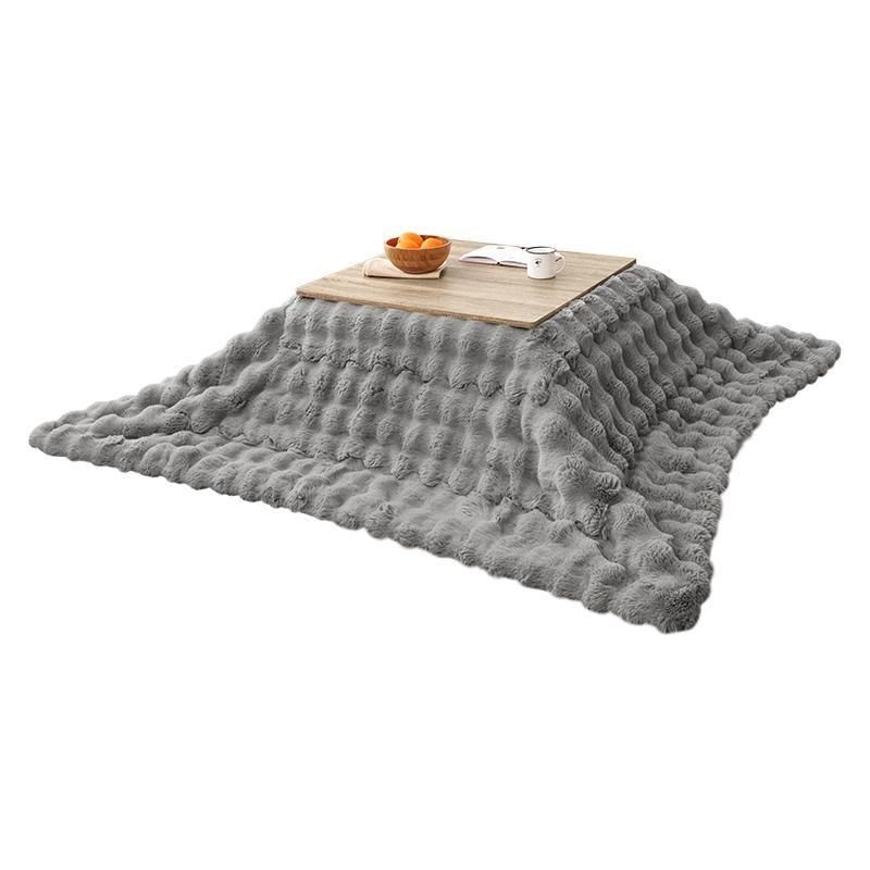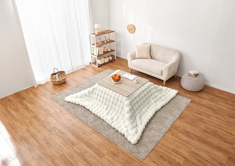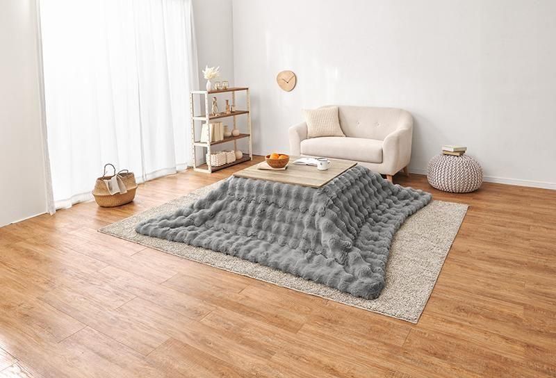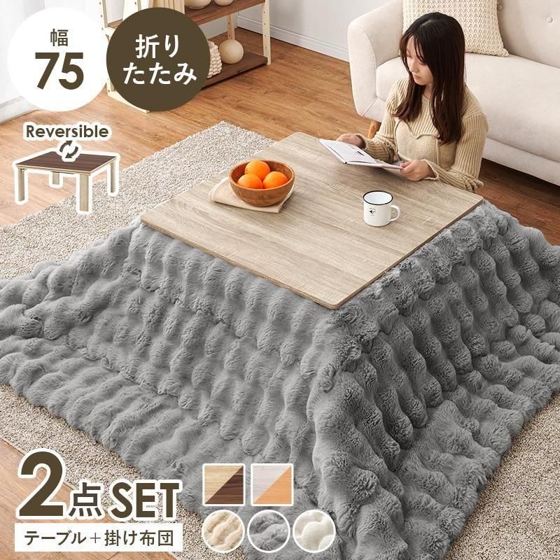 シンプルなデザインで天板リバーシブル、収納に便利な折れ脚コタツ。ラビットファーのような、ふわもこの掛け布団セット