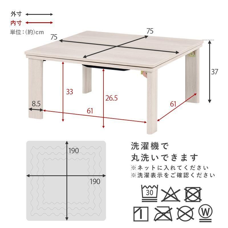 • サイズ : こたつ:(約)幅75×奥行75×高さ37cm、掛ふとん:(約)190×190cm