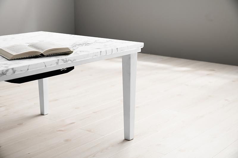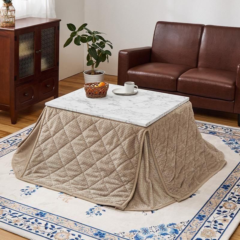おしゃれで可愛い大理石柄のこたつテーブル。コンパクトでひとり暮らしのお部屋でも置きやすいサイズです。立体感のあるニット柄の省スペース掛け布団セット
