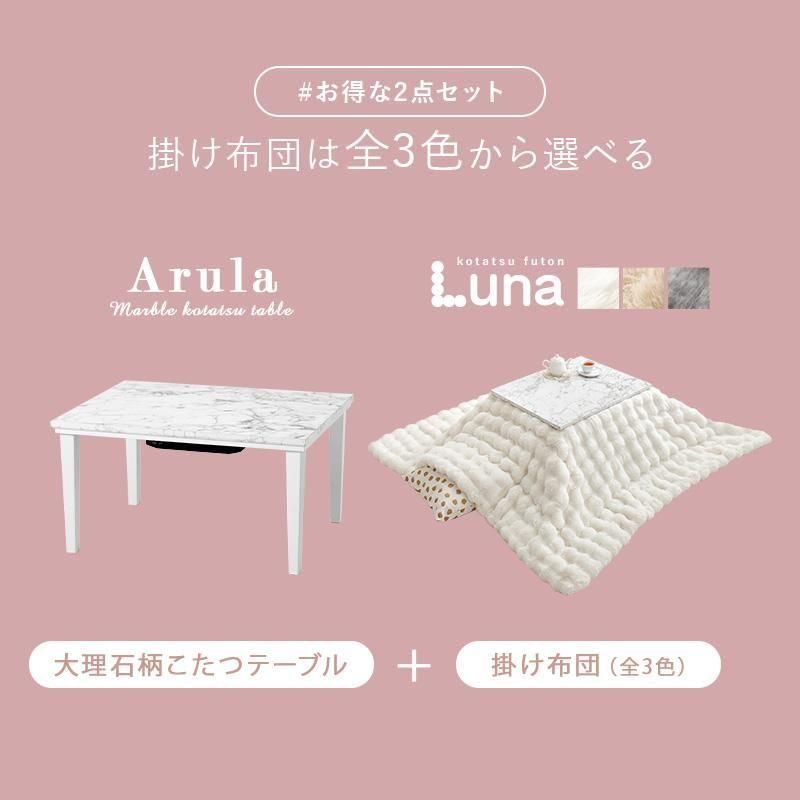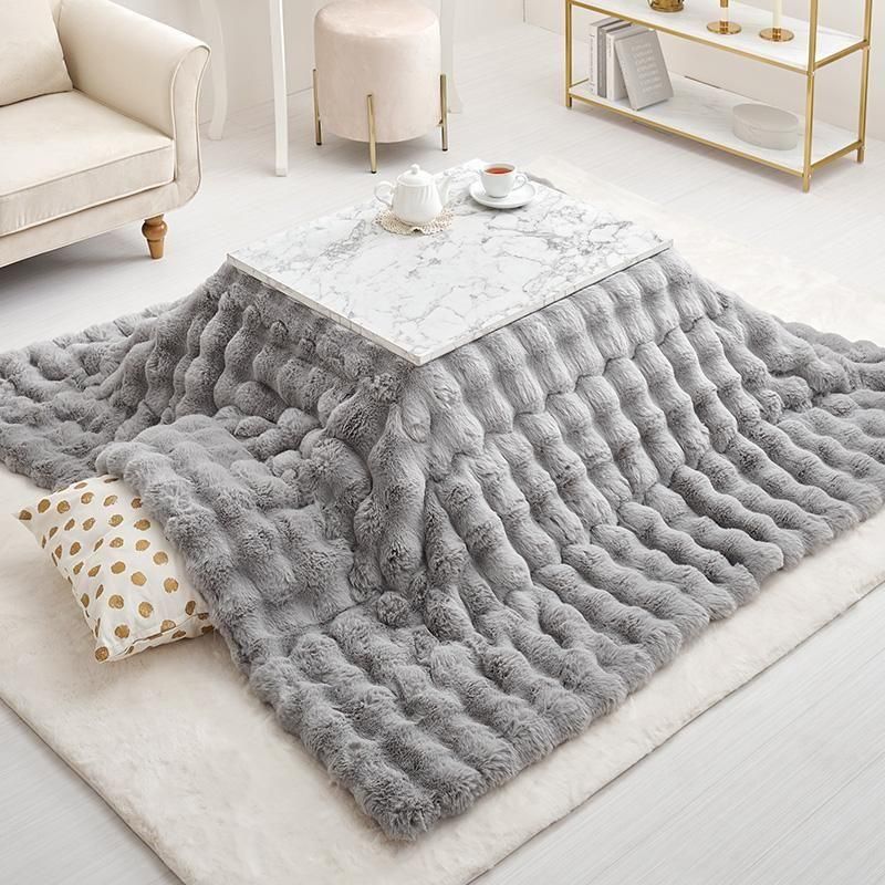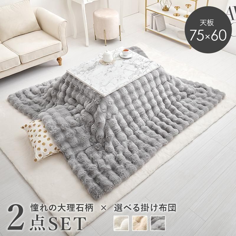 おしゃれで可愛い大理石柄のこたつテーブル。コンパクトでひとり暮らしのお部屋でも置きやすいサイズです。ラビットファーのような、ふわもこの掛け布団セット