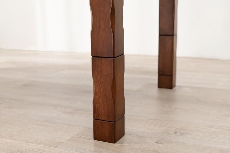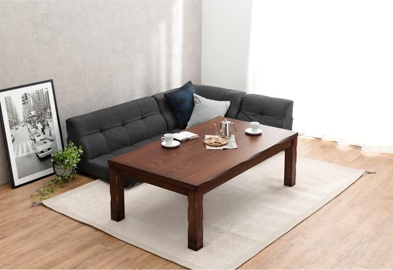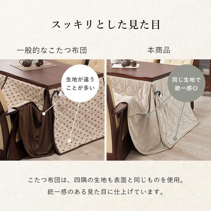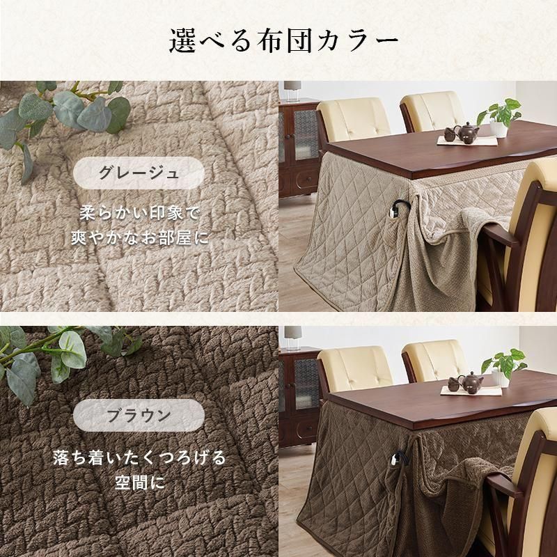 天板、脚に和風のなぐり加工を施した高級感あふれるダイニングこたつテーブル。座る環境に合わせて天板高さを4段階に調節可能な多段継脚タイプです。立体感のあるニット柄の省スペース掛け布団セット
