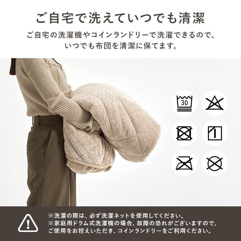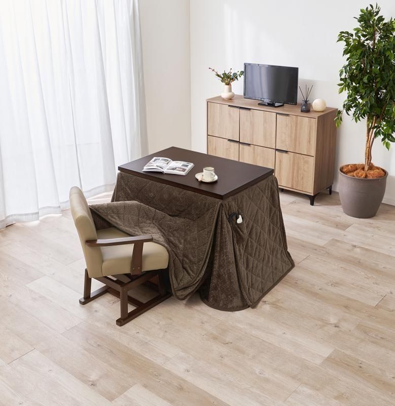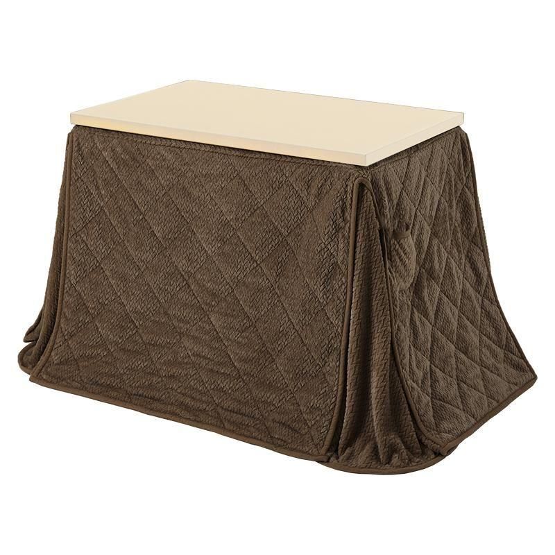 細かく編みこまれた立体感のあるニット柄が上品なこたつ布団。ダイニングタイプのこたつに合わせたこたつの熱を逃がしにくい省スペース仕様で、ヒーターのリモコンを入れるポケット付き。
