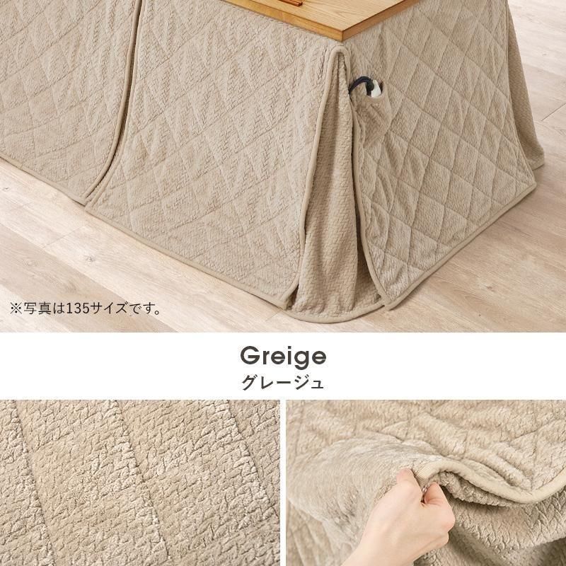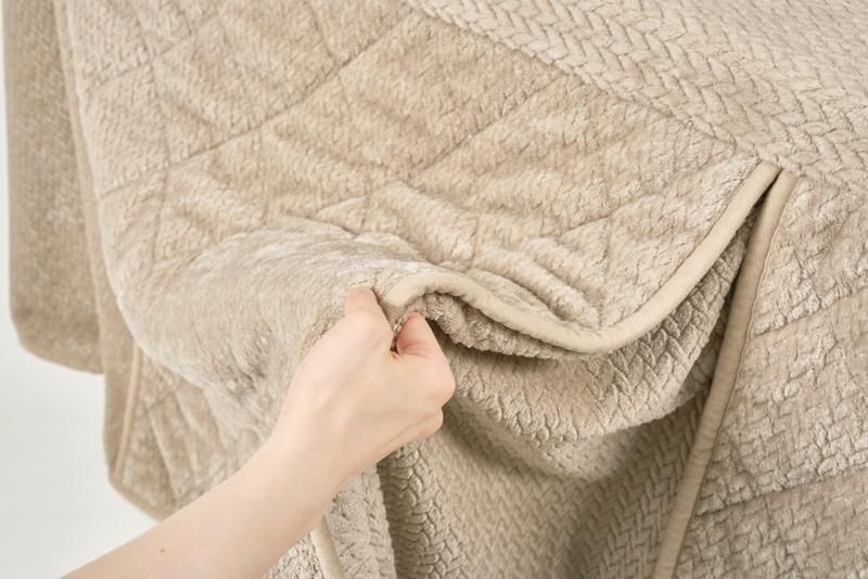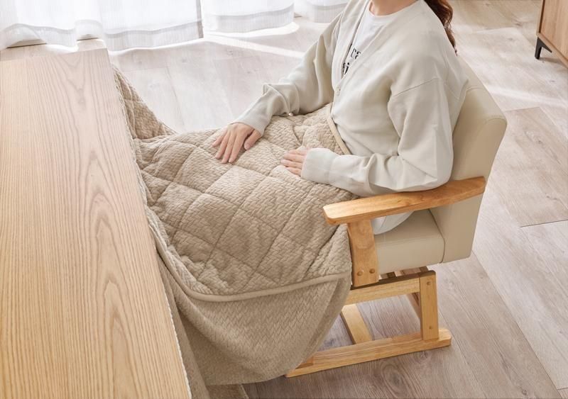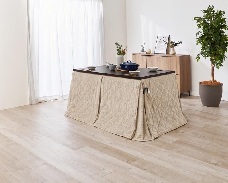 細かく編みこまれた立体感のあるニット柄が上品なこたつ布団。ダイニングタイプのこたつに合わせたこたつの熱を逃がしにくい省スペース仕様で、ヒーターのリモコンを入れるポケット付き。