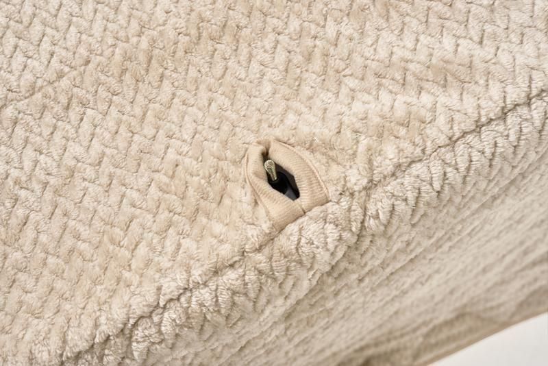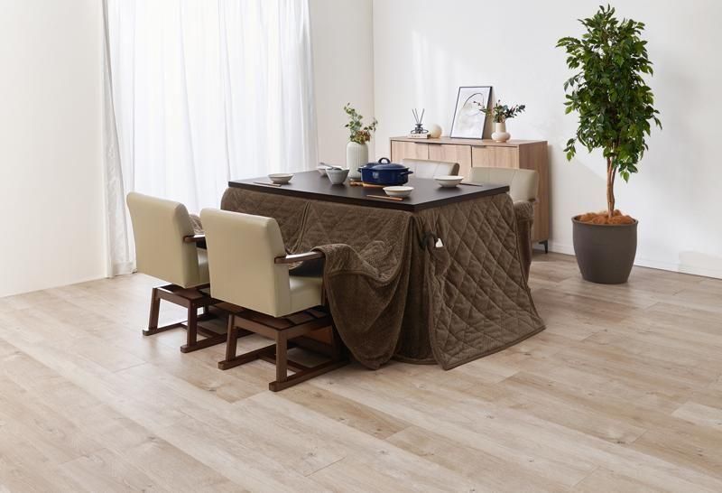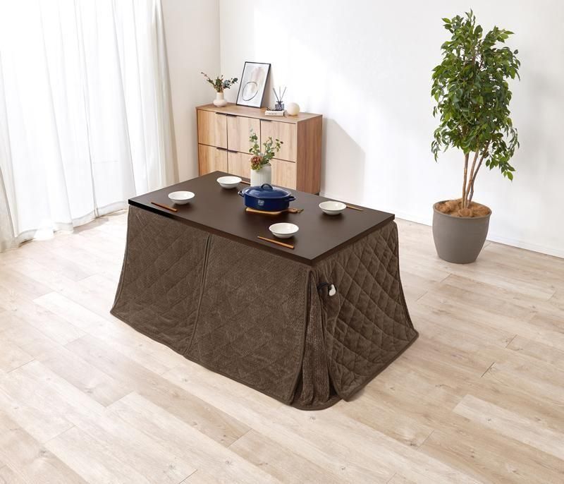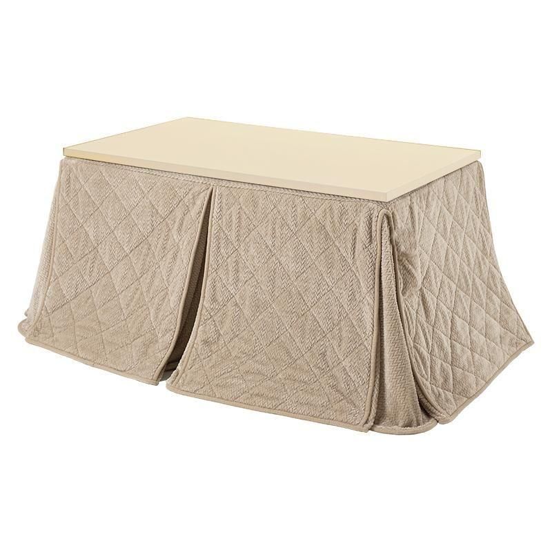 細かく編みこまれた立体感のあるニット柄が上品なこたつ布団。ダイニングタイプのこたつに合わせたこたつの熱を逃がしにくい省スペース仕様で、ヒーターのリモコンを入れるポケット付き。