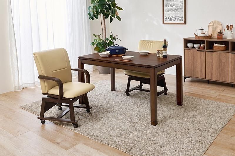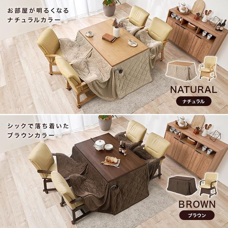- 素材 : こたつ:<天板><ブラウン>ウォールナット突板<ナチュラル>アッシュ突板、塗装:ウレタン樹脂塗装(UV加工) <脚部>ラバーウッド 、ヒーター:NN-8065 600W石英管ヒーター(手元コントローラー)、ふとん:< 側地><中材>ポリエステル100%、チェア:<フレーム>天然木<張地>合成皮革