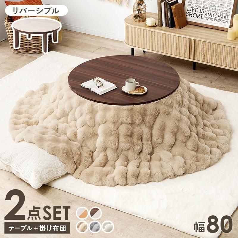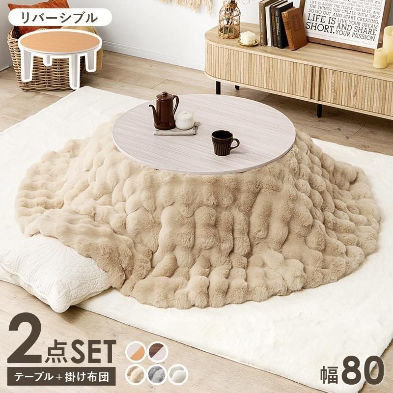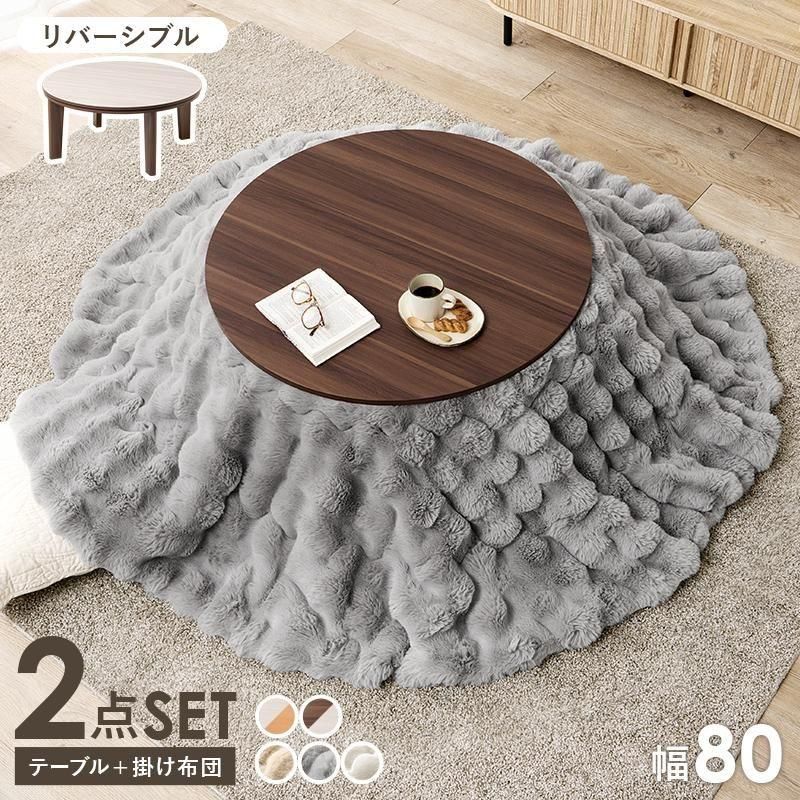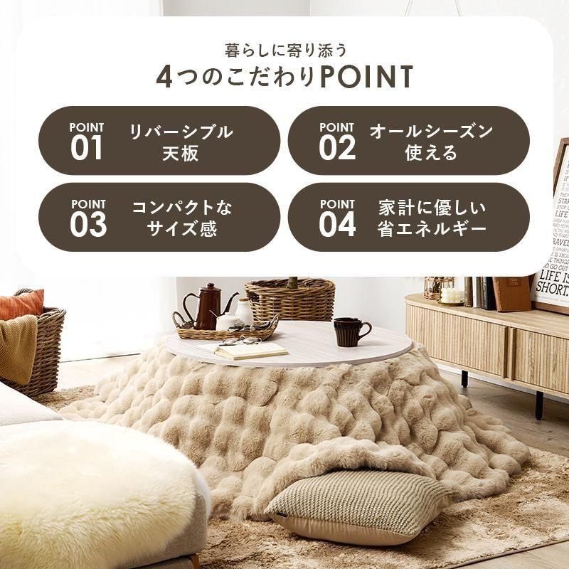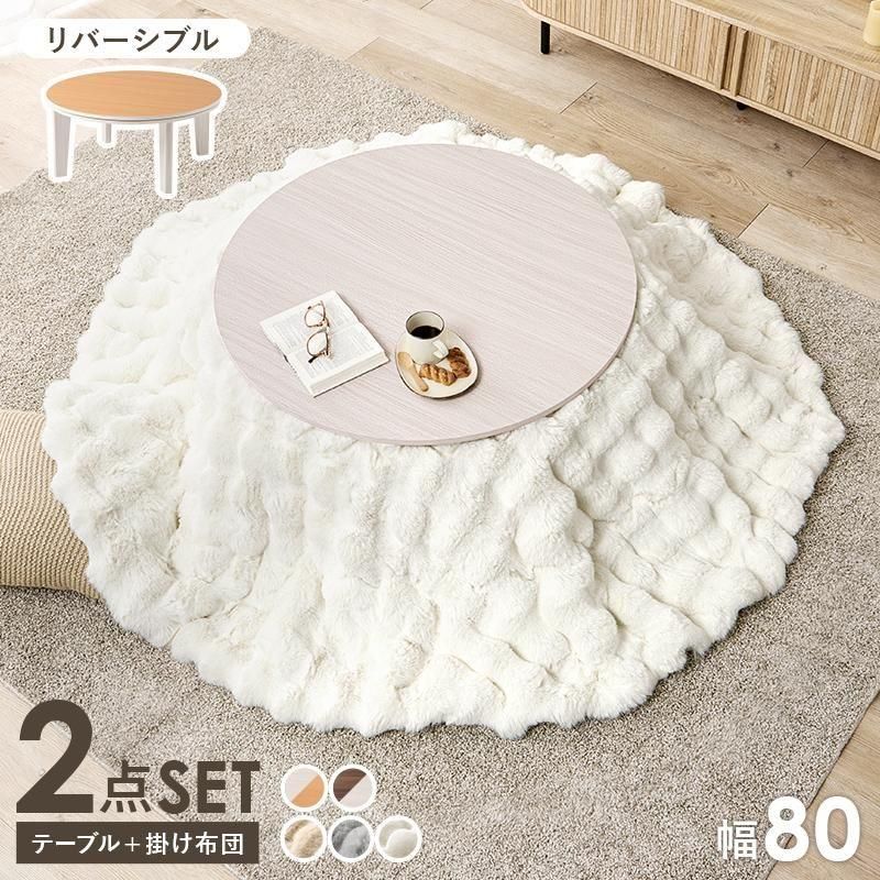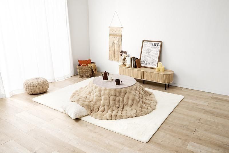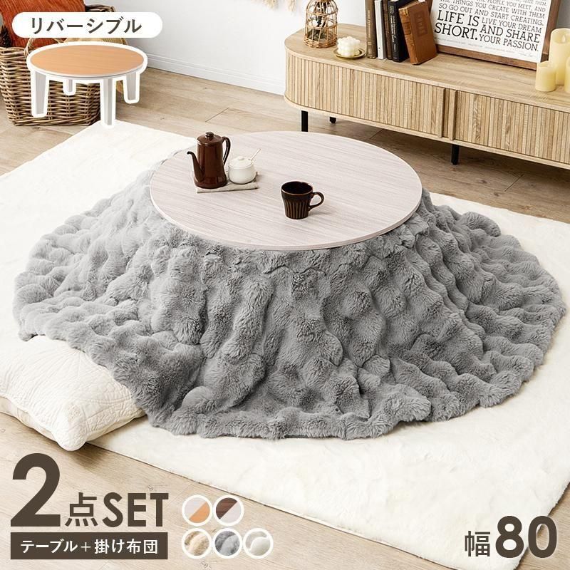 天板がリバーシブルでオールシーズン活躍するカジュアルコタツ。ラビットファーのような、ふわもこの掛け布団セット