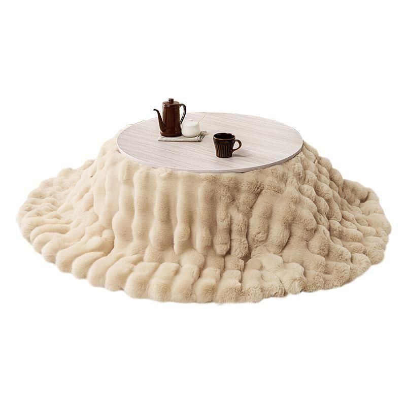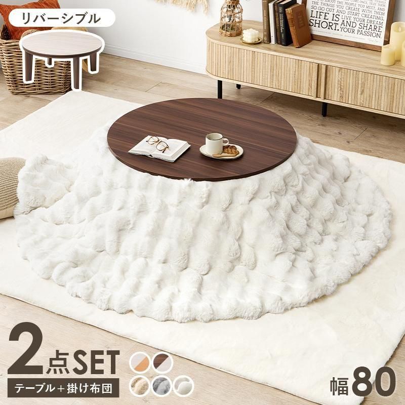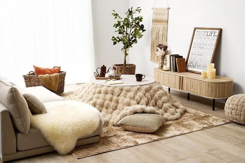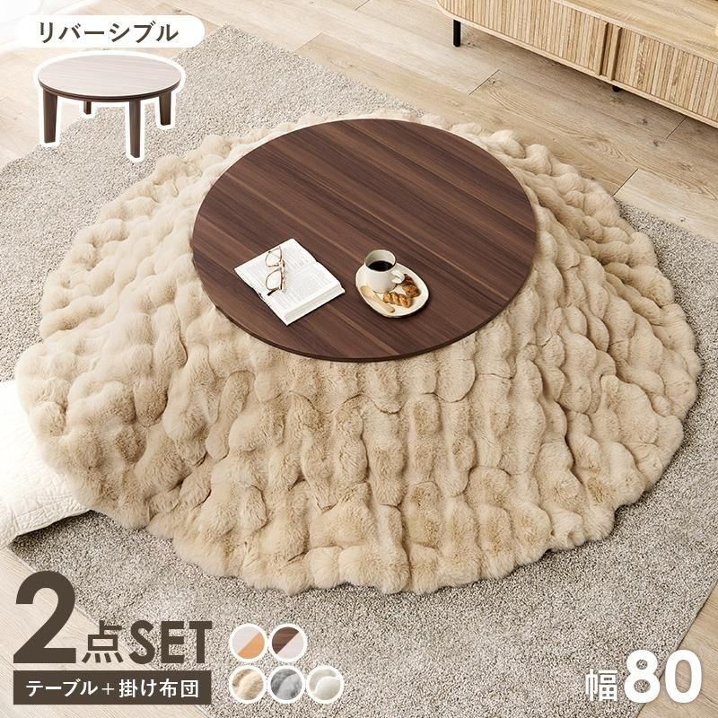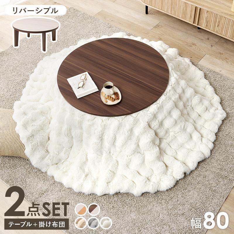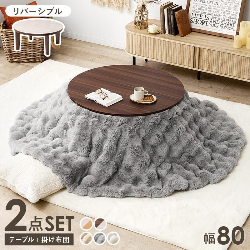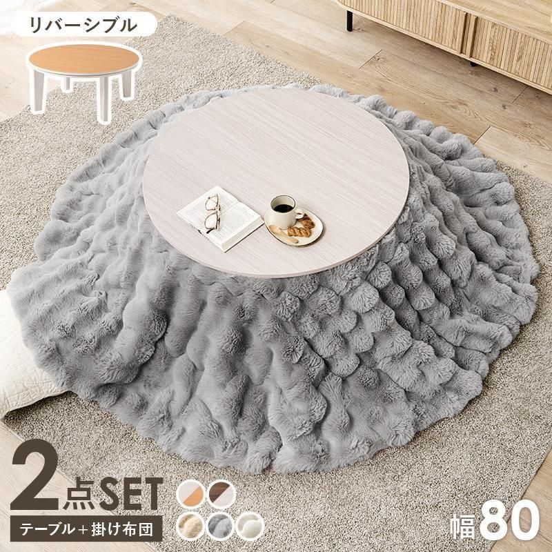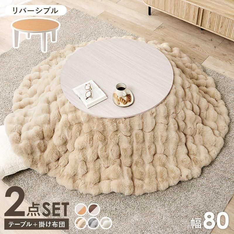 天板がリバーシブルでオールシーズン活躍するカジュアルコタツ。ラビットファーのような、ふわもこの掛け布団セット