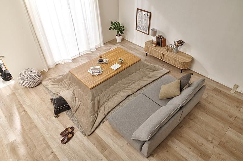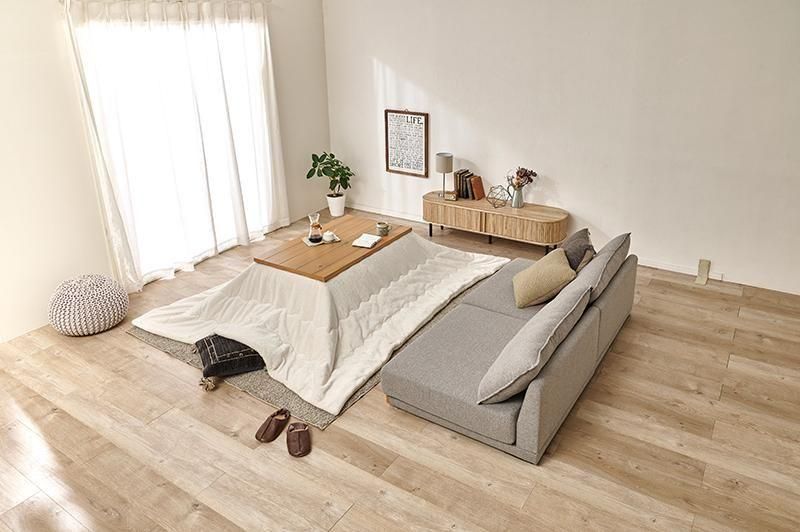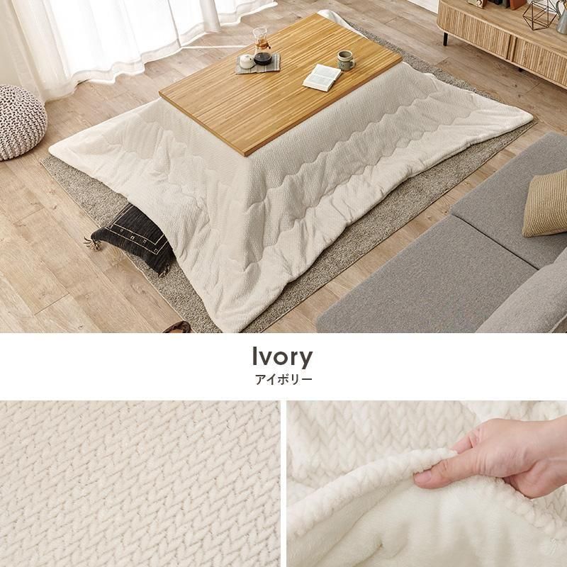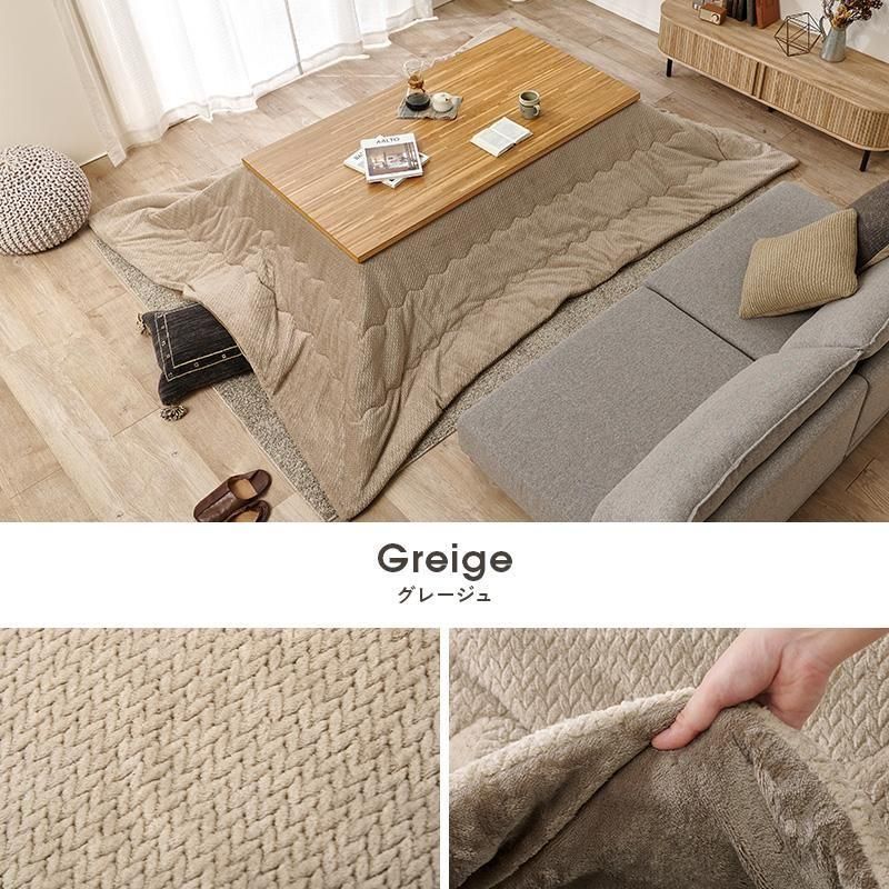 細かく編みこまれた立体感のあるニット柄が上品なこたつ布団。もこもこしすぎない厚みでコンパクトに収納可能。洗濯可能