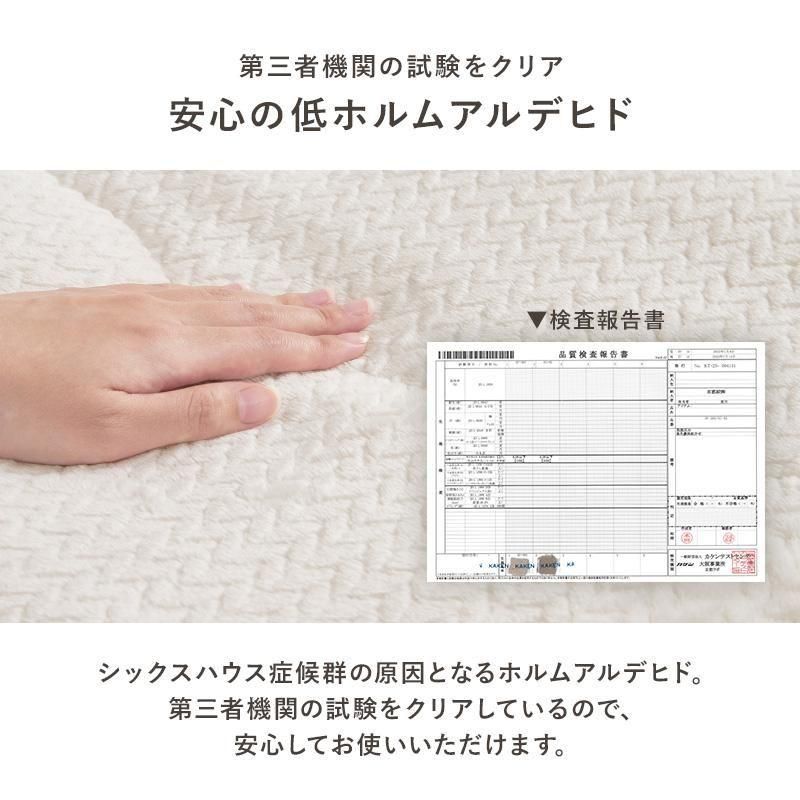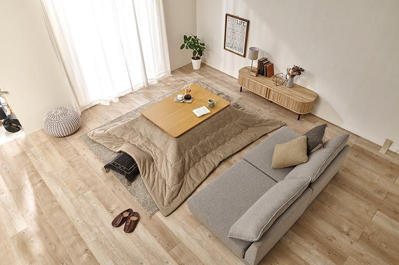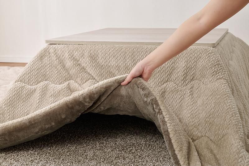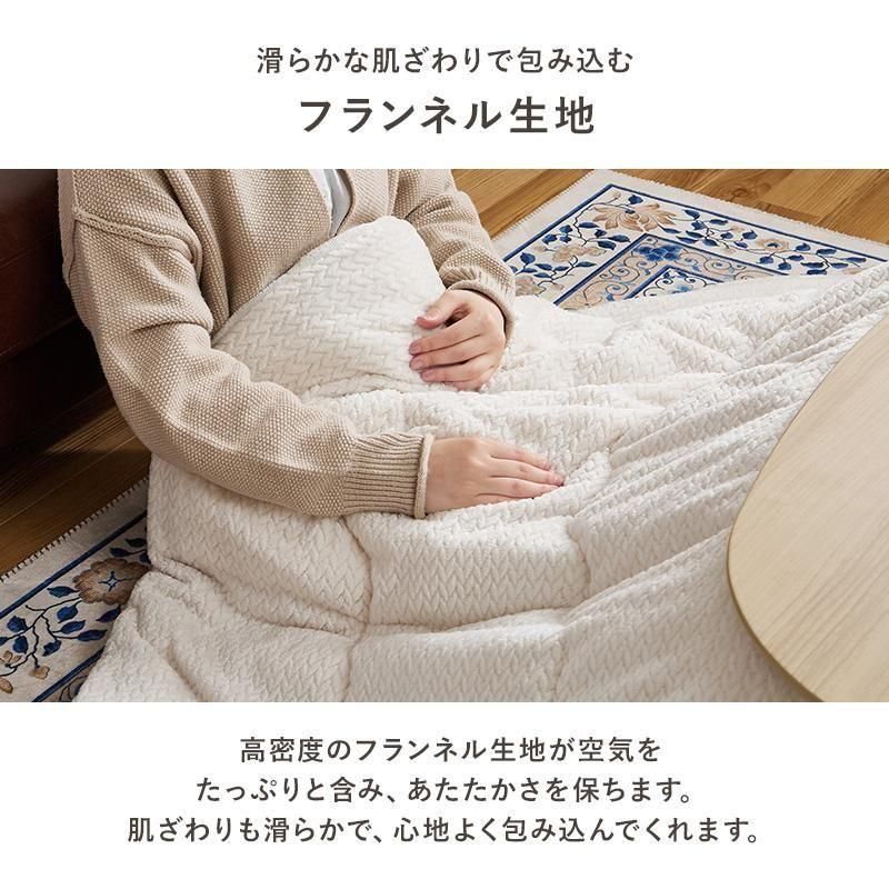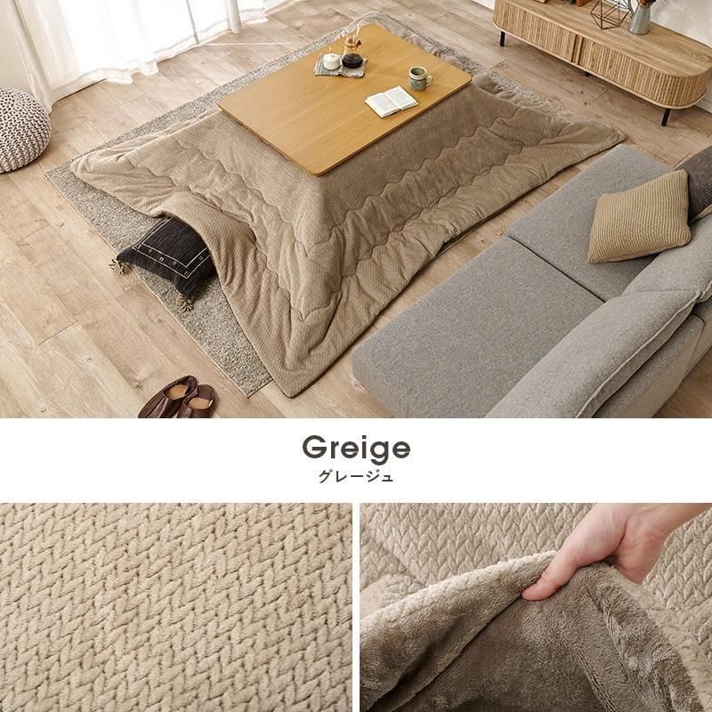 細かく編みこまれた立体感のあるニット柄が上品なこたつ布団。もこもこしすぎない厚みでコンパクトに収納可能。洗濯可能
