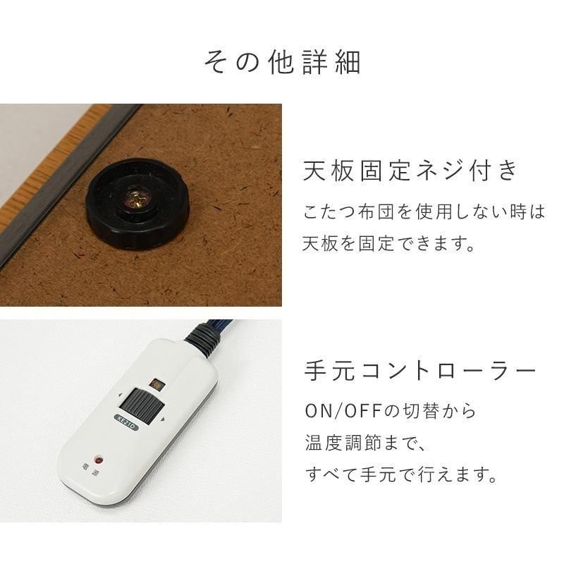 - 素材 : こたつ:<天板>天然木化粧繊維板(UV塗装)<脚部>ラバーウッド、ヒーター:MCR-301E 300W面状カーボンヒーター(電子手元コントローラー)、ふとん:< 側地><中材>ポリエステル100%