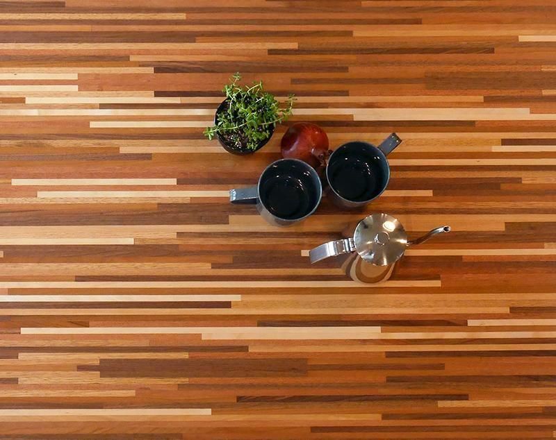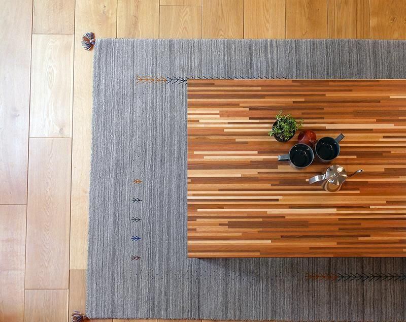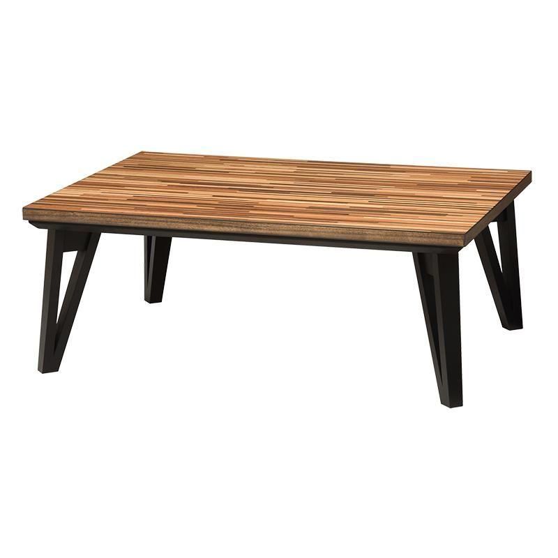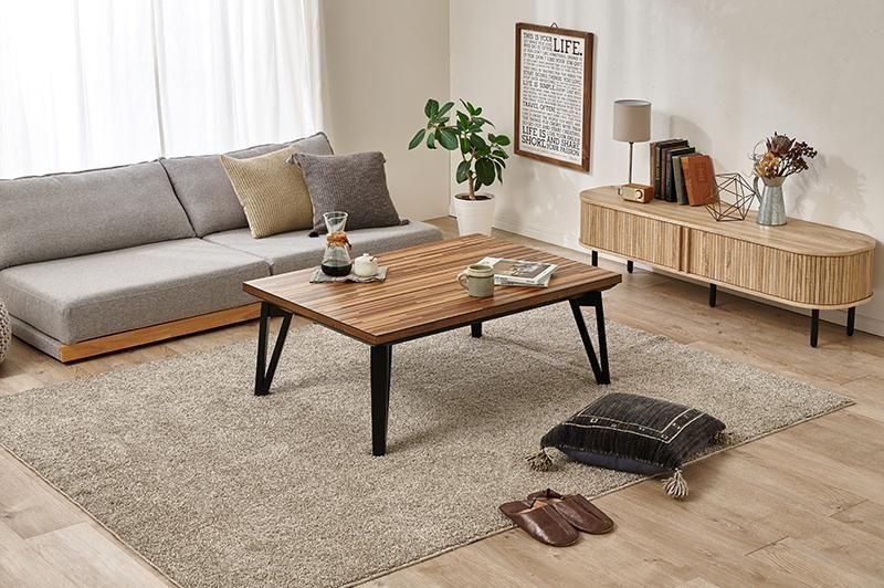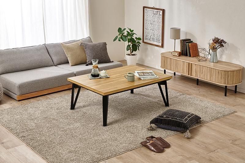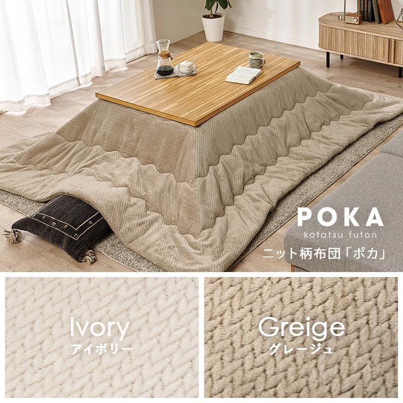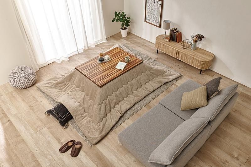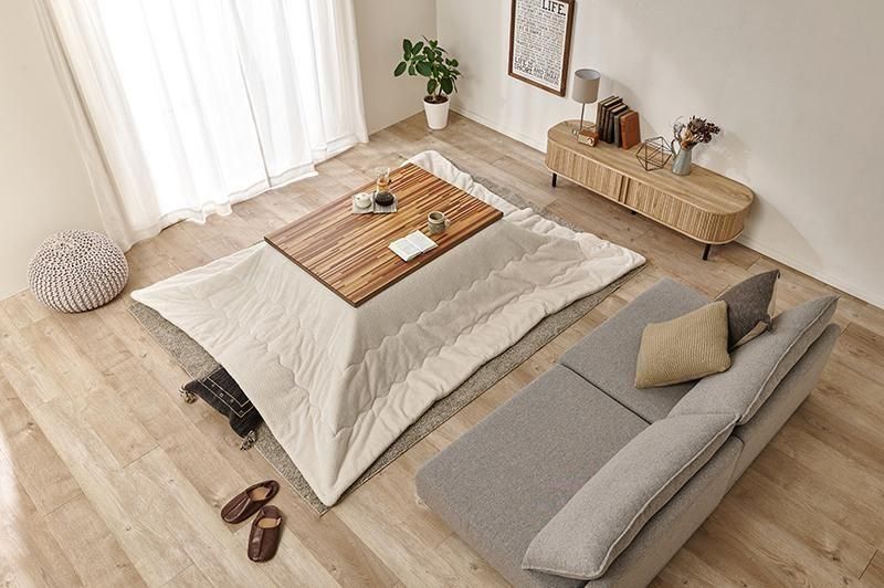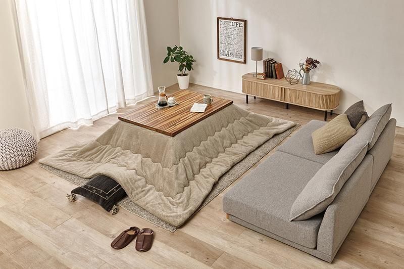 細やかな寄木細工調の天板と三角脚がスタイリッシュなコタツ。立体感のあるニット柄の掛け布団セット