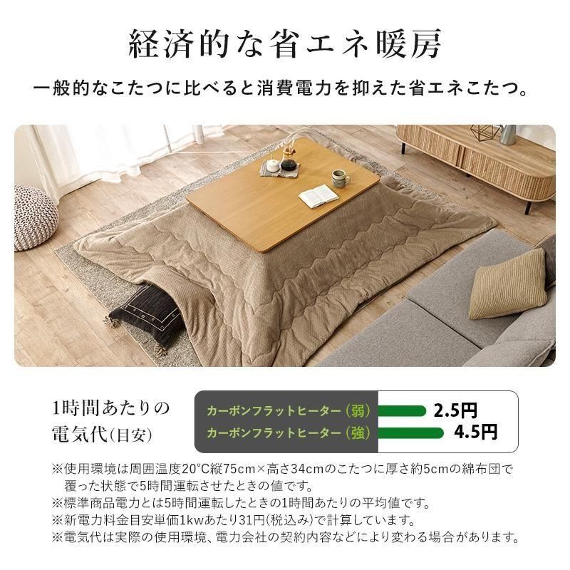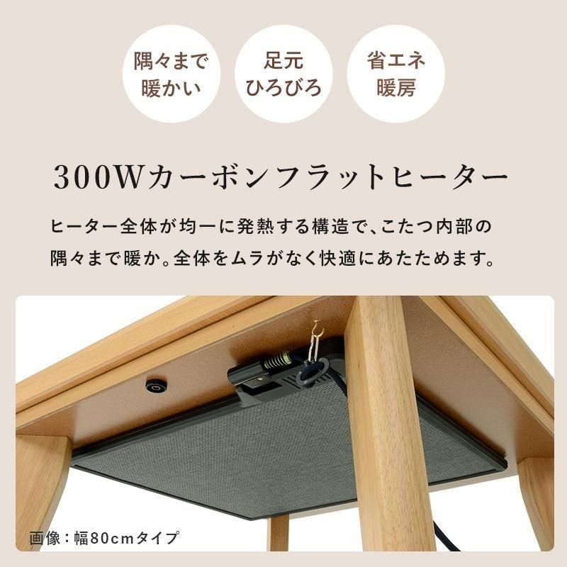 - 素材 : こたつ:<天板>天然木化粧繊維板(ナチュラル/アッシュ・ブラウン/ウォールナット)<脚部>ラバーウッド、ヒーター:MCR-301E 300W面状カーボンヒーター(電子手元コントローラー)、ふとん:< 側地><中材>ポリエステル100%