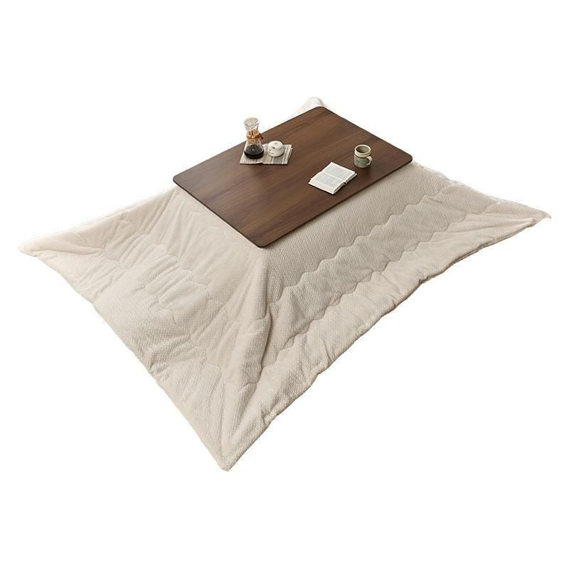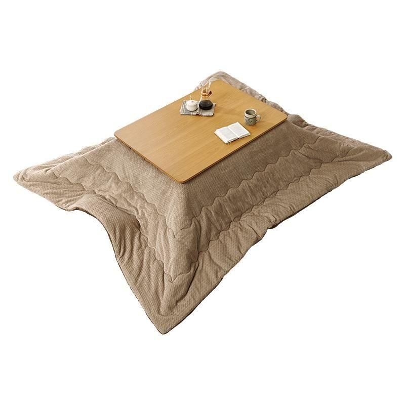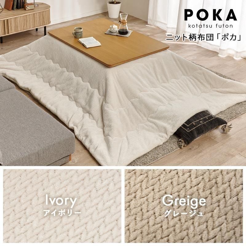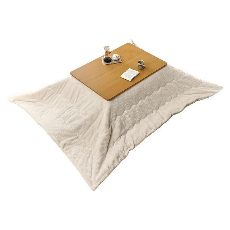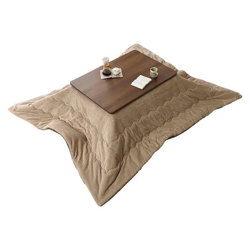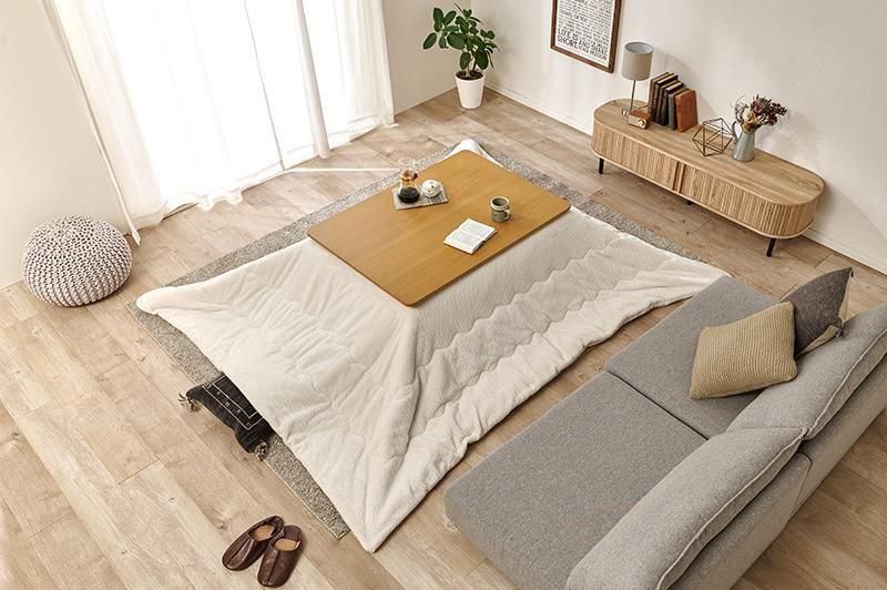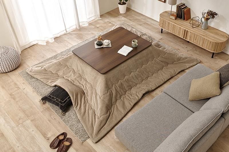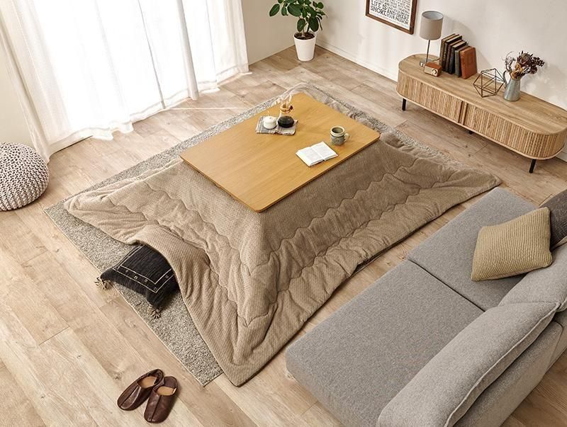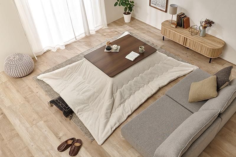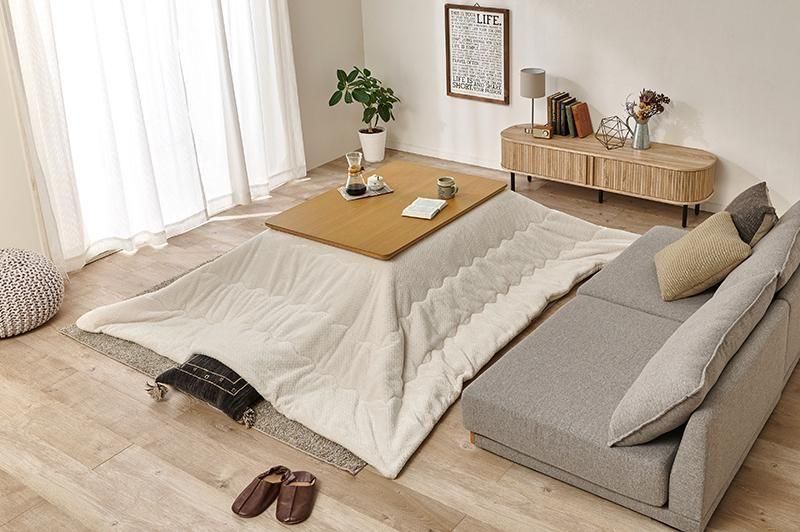 スタイリッシュながら存在感のあるディテール、薄型ヒーターを使用しているため一年中使いやすいコタツ。立体感のあるニット柄の掛け布団セット