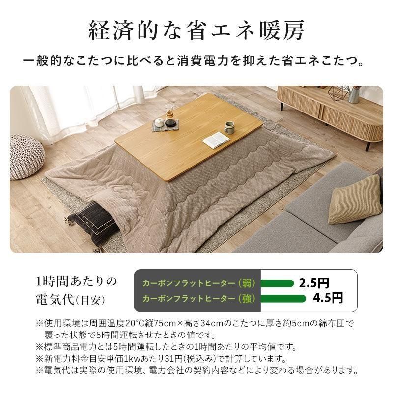 - 素材 : こたつ:<天板>天然木化粧繊維板(ナチュラル/アッシュ・ブラウン/ウォールナット)<脚部>ラバーウッド、ヒーター:MCR-301E 300W面状カーボンヒーター(電子手元コントローラー)、ふとん:< 側地><中材>ポリエステル100%