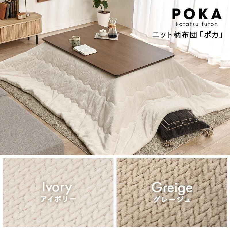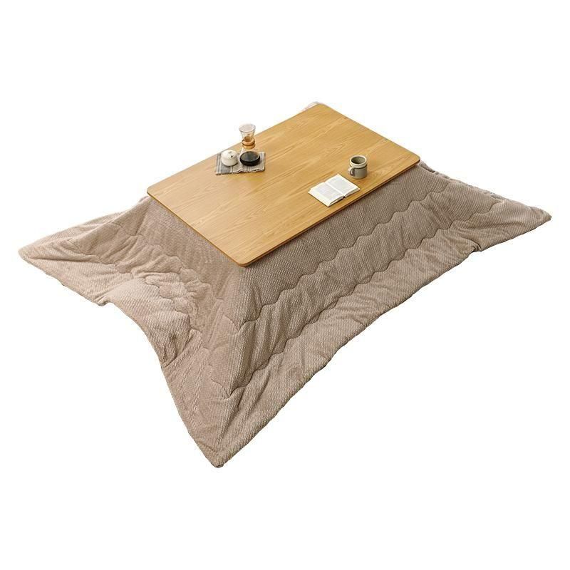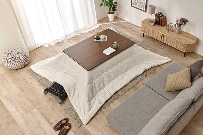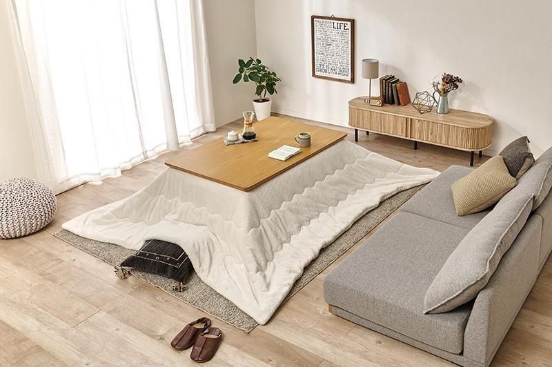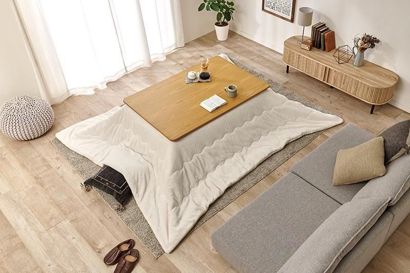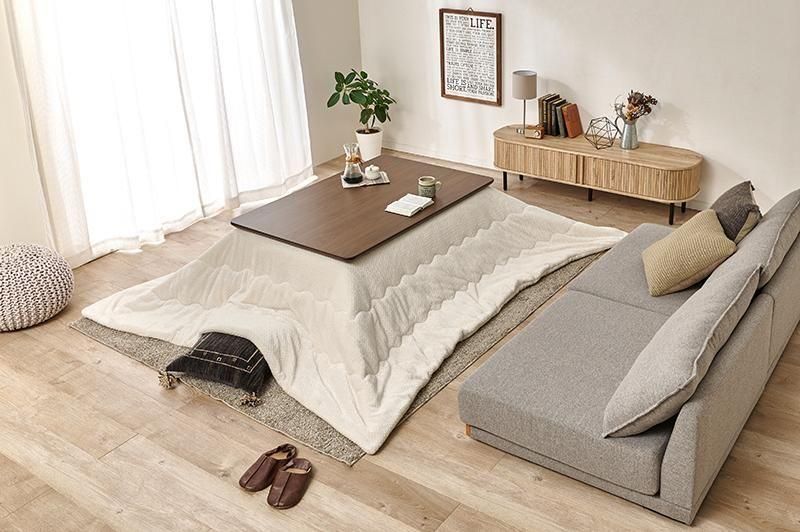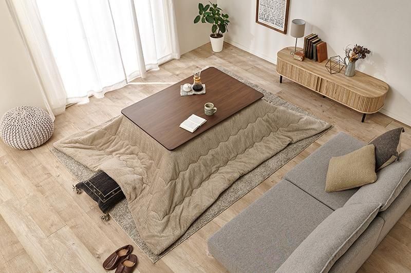 スタイリッシュながら存在感のあるディテール、薄型ヒーターを使用しているため一年中使いやすいコタツ。立体感のあるニット柄の掛け布団セット