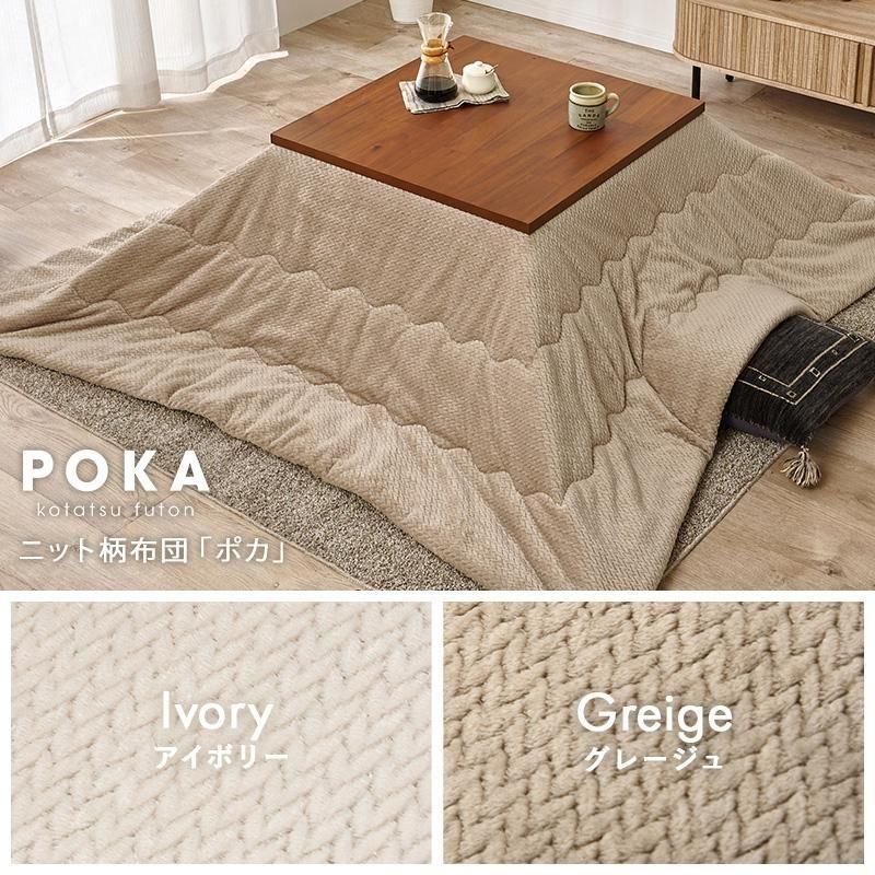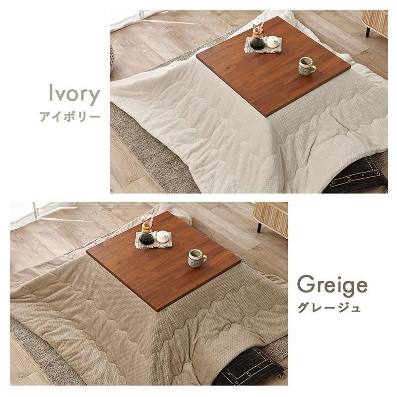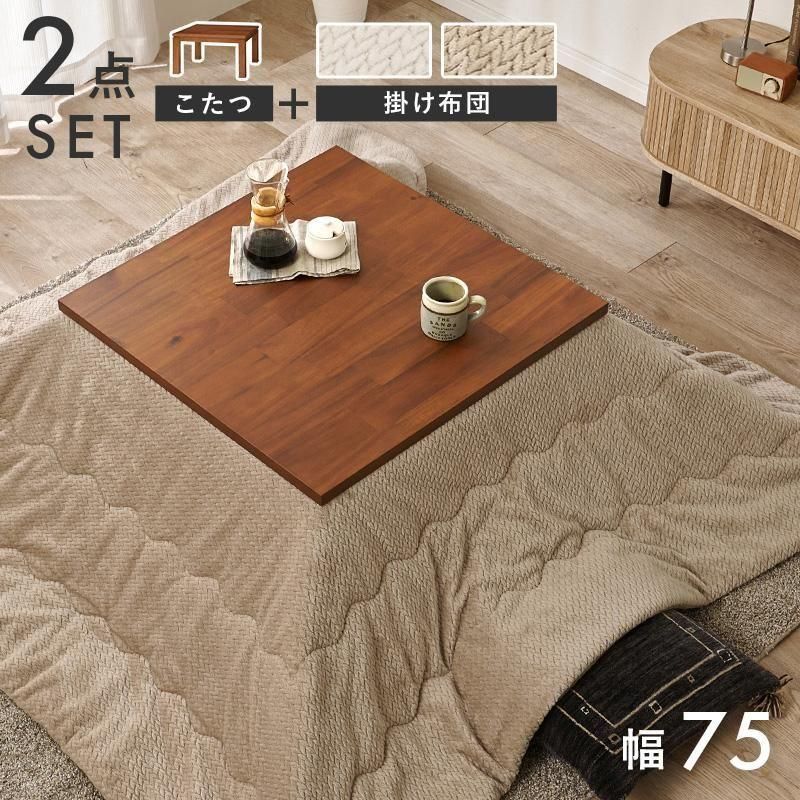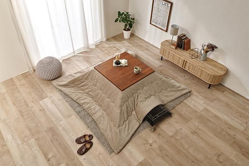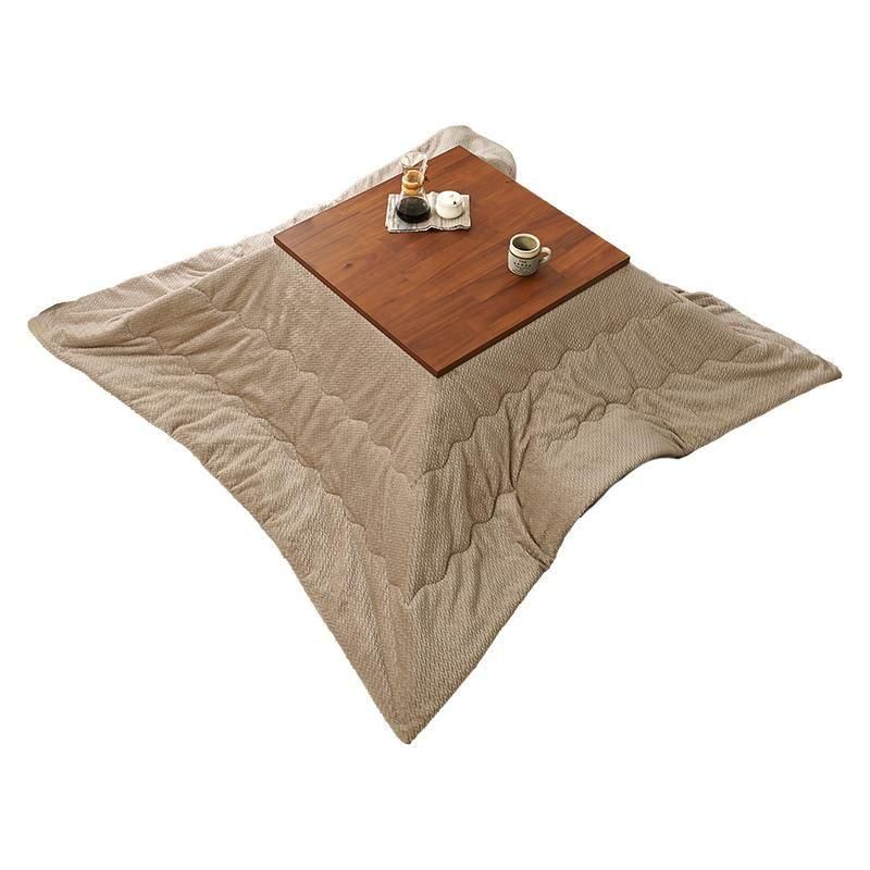 天然木アカシアの集成材突板を使用し、味のある風合いを楽しめるこたつテーブル。立体感のあるニット柄の掛け布団セット
