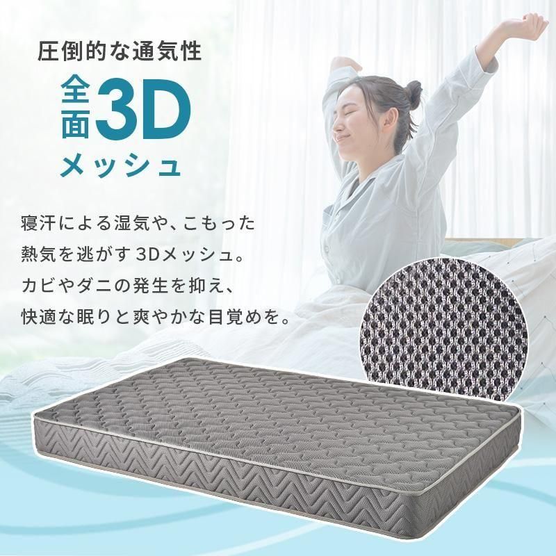 通気性の良い3Dメッシュ生地を全面に使用し、寝返りのたびにマットレスの熱気や湿気を逃がします。表裏の両面仕様なのでローテーションすればヘタリを抑えて長く使えます。